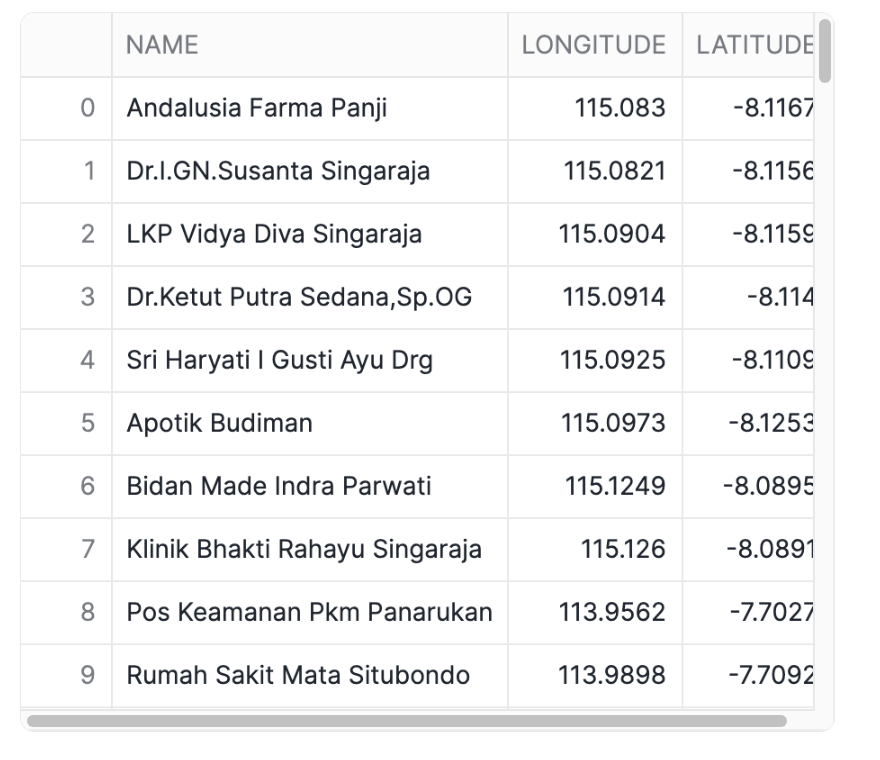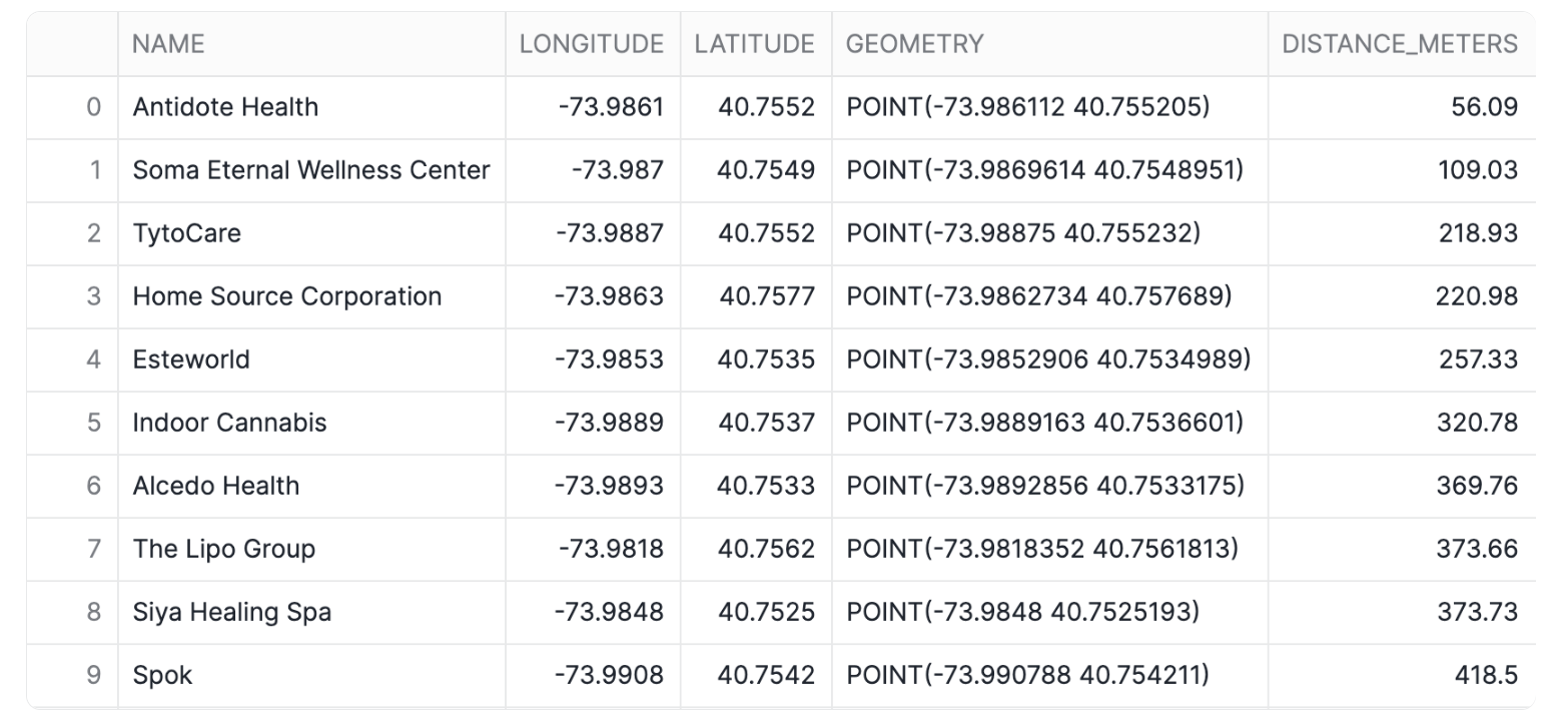 SELECT NAMES['primary']::STRING AS NAME, ST_X(GEOMETRY) AS LONGITUDE, ST_Y(GEOMETRY) AS LATITUDE, FROM OVERTURE_MAPS__PLACES.CARTO.PLACE, LATERAL FLATTEN(INPUT => ADDRESSES:list) AS ADDRESS WHERE CATEGORIES['primary'] ='health_and_medical' LIMIT 100;