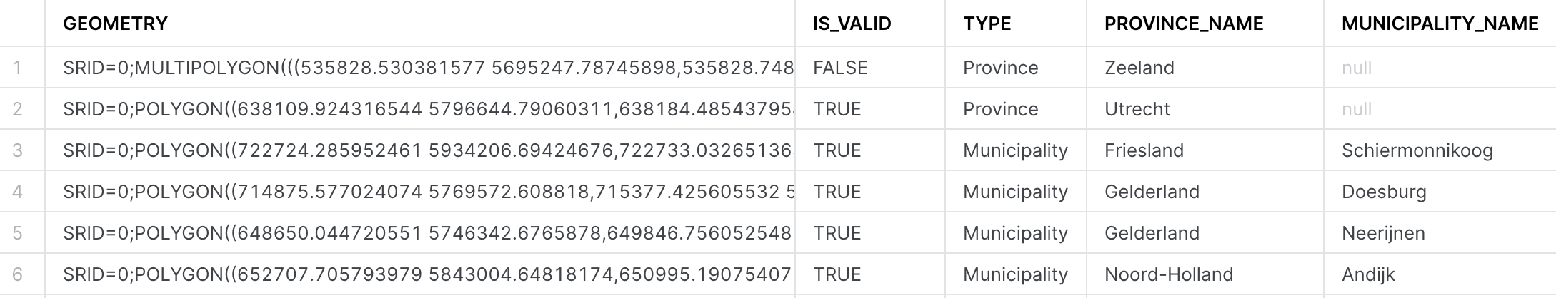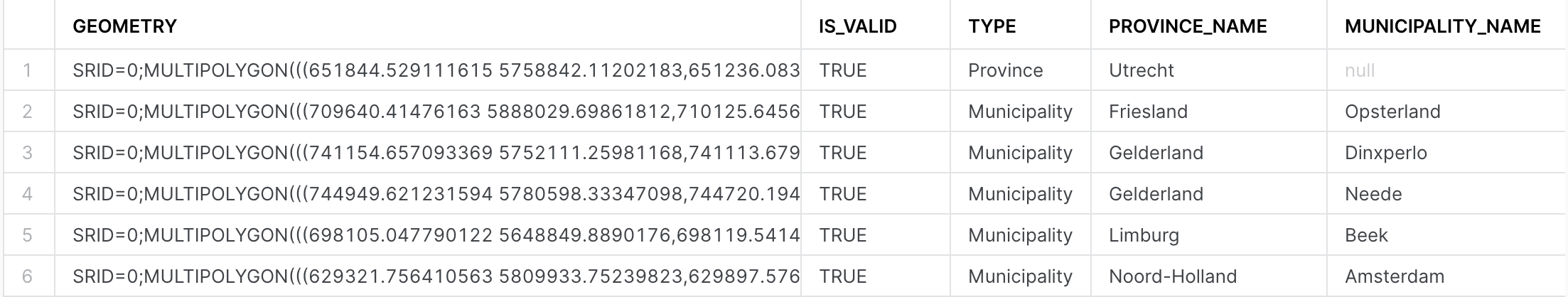 Note that while the column is named GEOMETRY in this data source, it is stored in a GEOGRAPHY column in Snowflake, using the coordinate system ESPG:4326, also known as WGS 84. This coordinate system uses latitude and longitude as coordinates and is the most widely used coordinate system worldwide. If you are storing geospatial data using latitude and longitude, then the GEOGRAPHY data type is the most suitable for storing your data.
