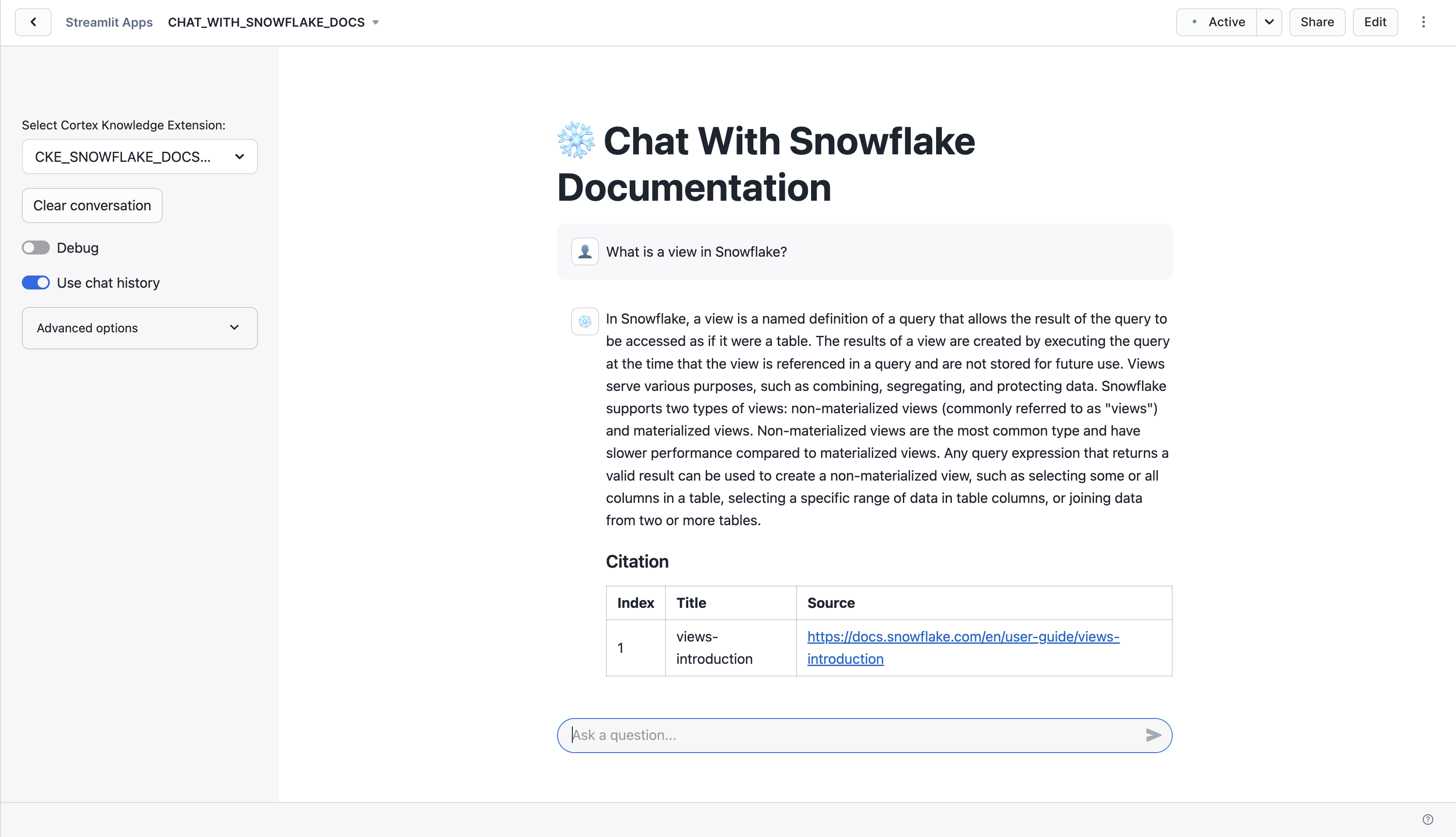 Congratulations! You've built a RAG chatbot that uses a Cortex Knowledge Extension.