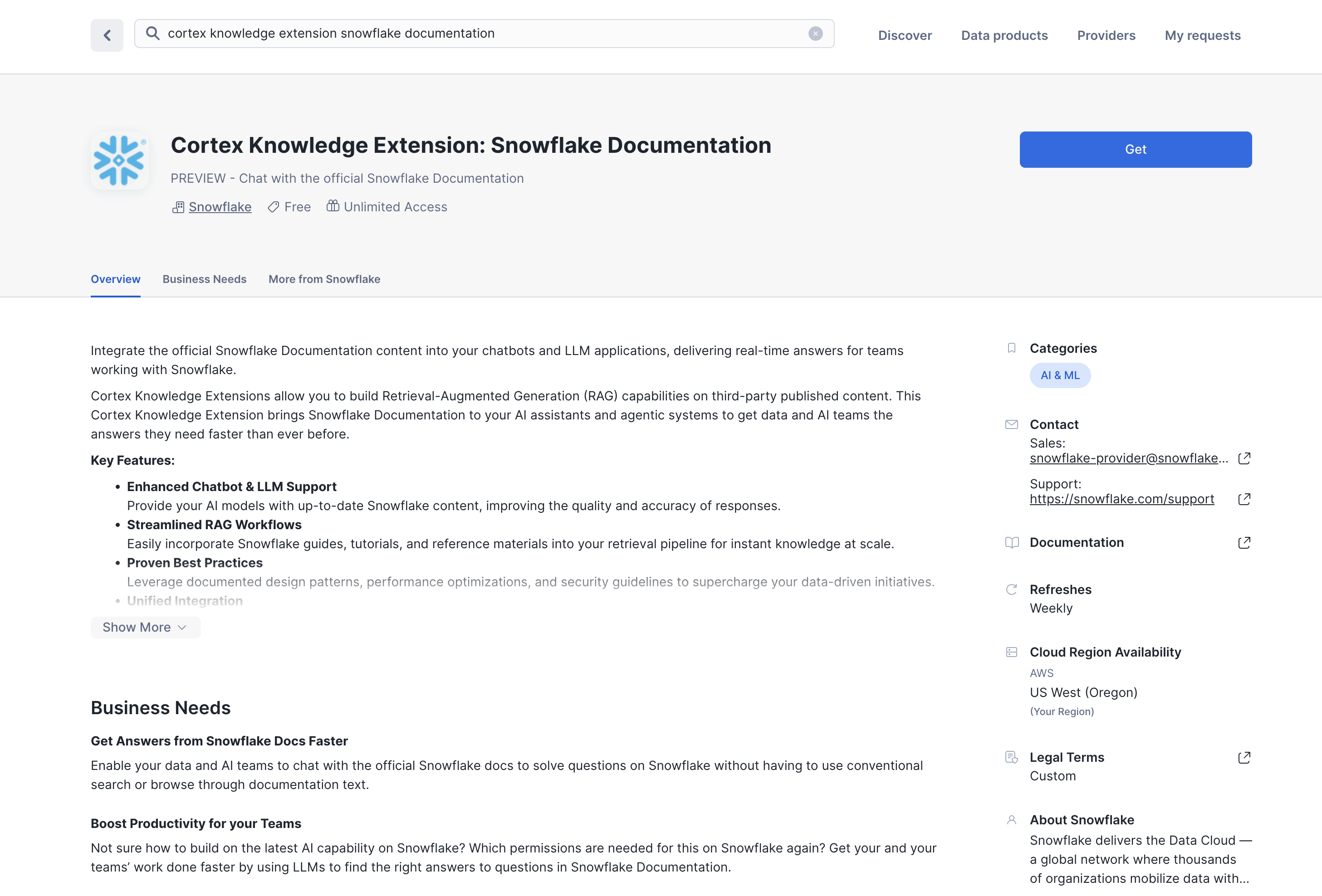 The first result should be "Cortex Knowledge Extension: Snowflake Documentation" by Snowflake. Click on the listing. You'll notice it's Free.