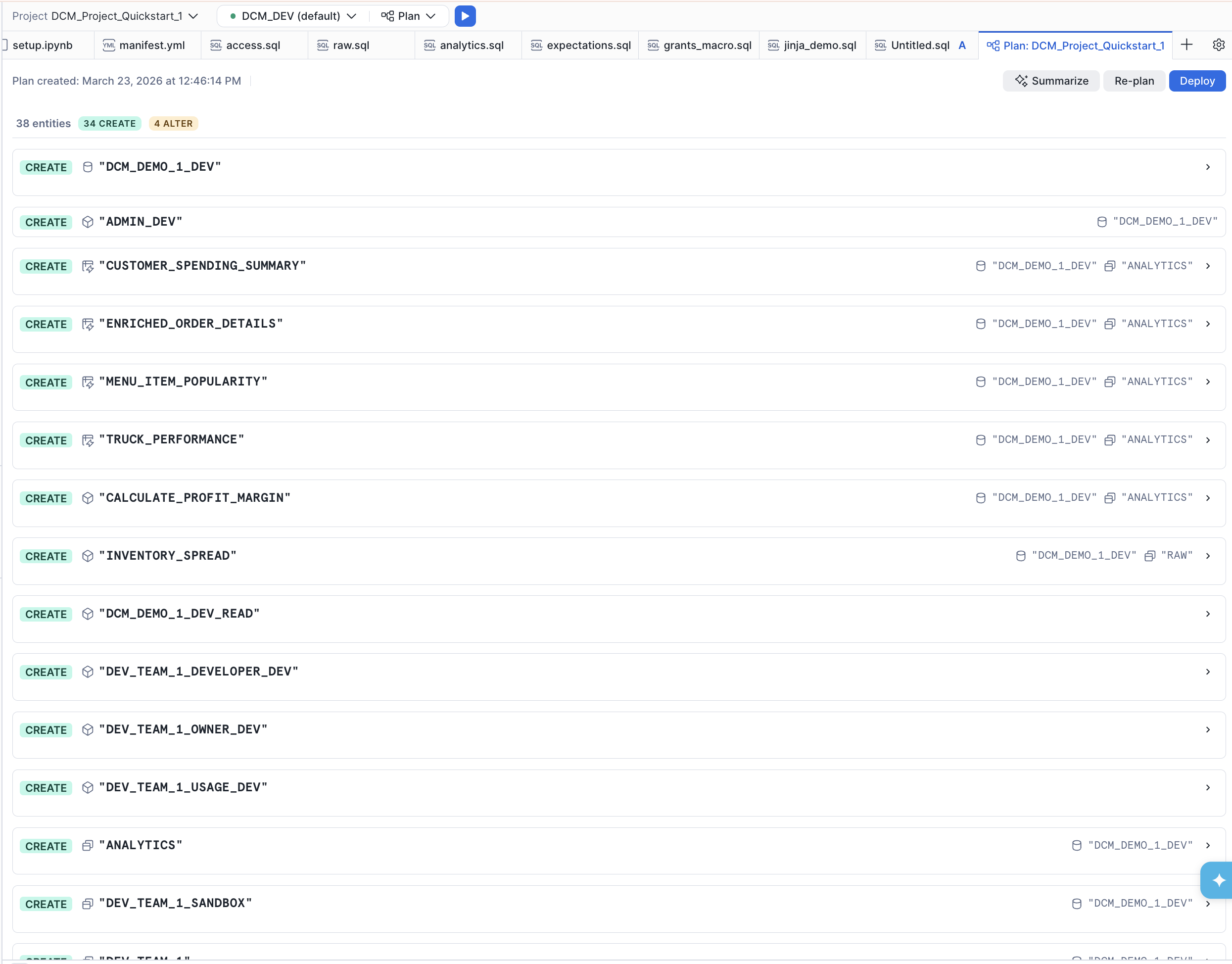 Open the jinja_demo.sql file from the plan output side-by-side with the original jinja_demo.sql in sources/definitions/ to see how the Jinja templating was resolved — loops expanded, conditionals evaluated, and variables replaced with their DEV configuration values.