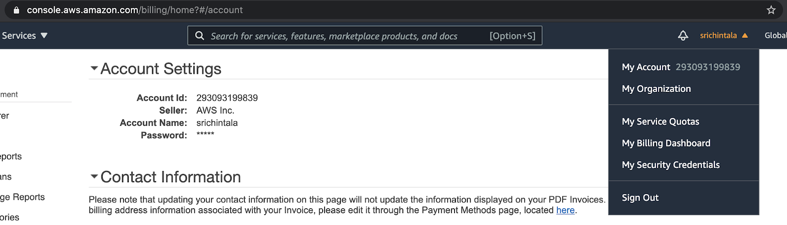 - Go to your user in the upper right corner of AWS and click the drop-down and select My Account.