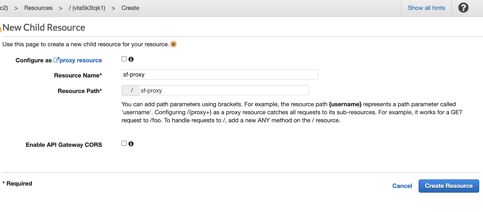 From the "New Child Resource" view, enter a name for the resource. Once you do so, record that name in your template under "Proxy Server Resource Name." Then, click "Create Resource."