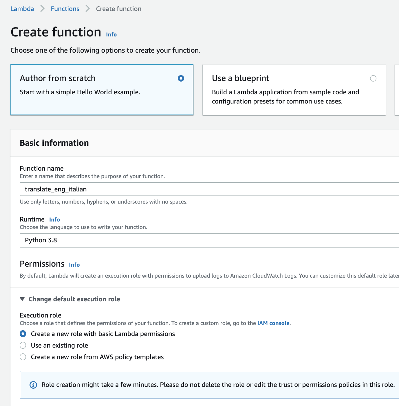 - Give your Lambda a name. Record this name in the template on the line labeled "Lambda Function Name." We'll be using the name "translate_eng_italian".