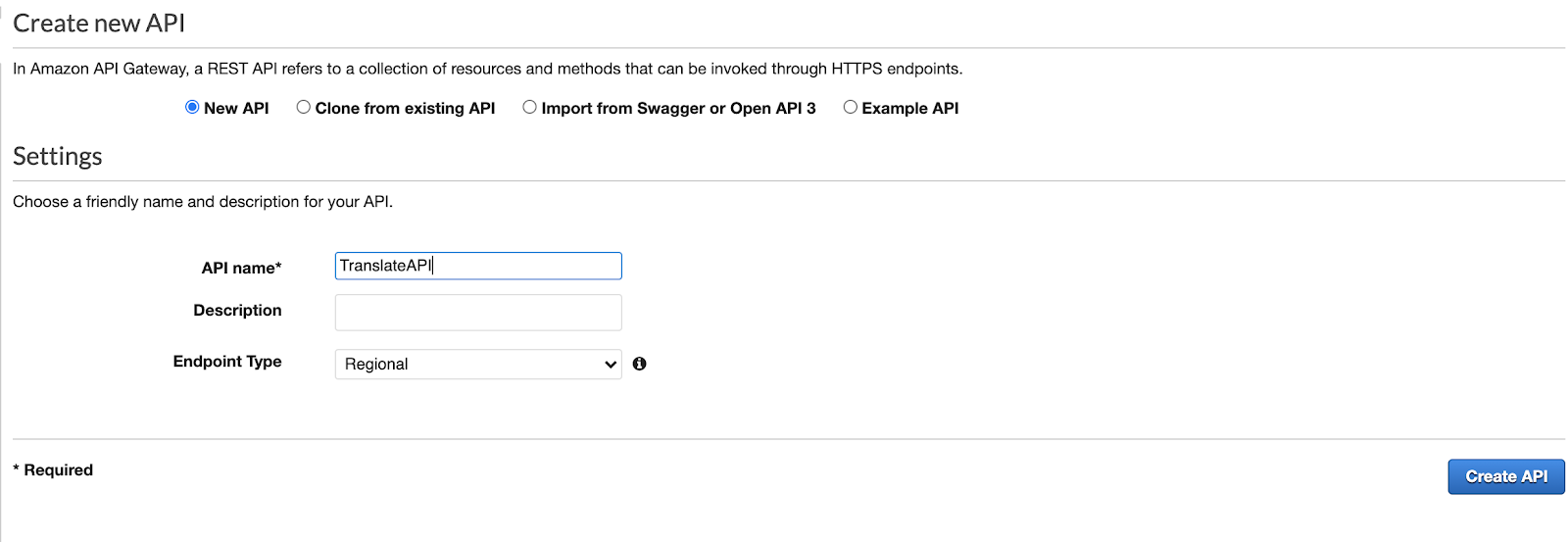 - Enter a name. We used "TranslateAPI."