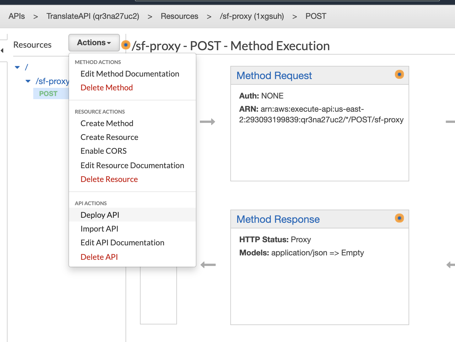 The next step is to deploy the API. Click the Actions drop-down again and select "Deploy API."