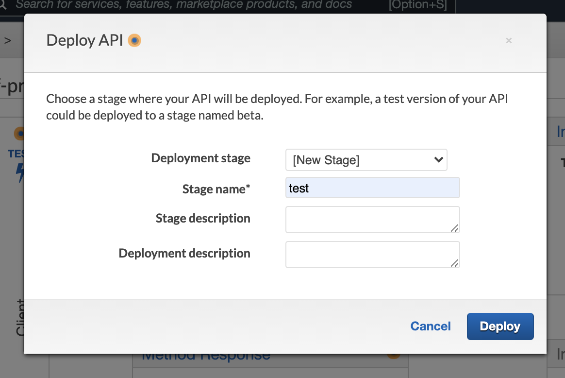 With this taken care of, you can securely redeploy the API. Do so by clicking on "API Name," "Actions," then "Deploy API." Select the stage you created earlier and click deploy.
