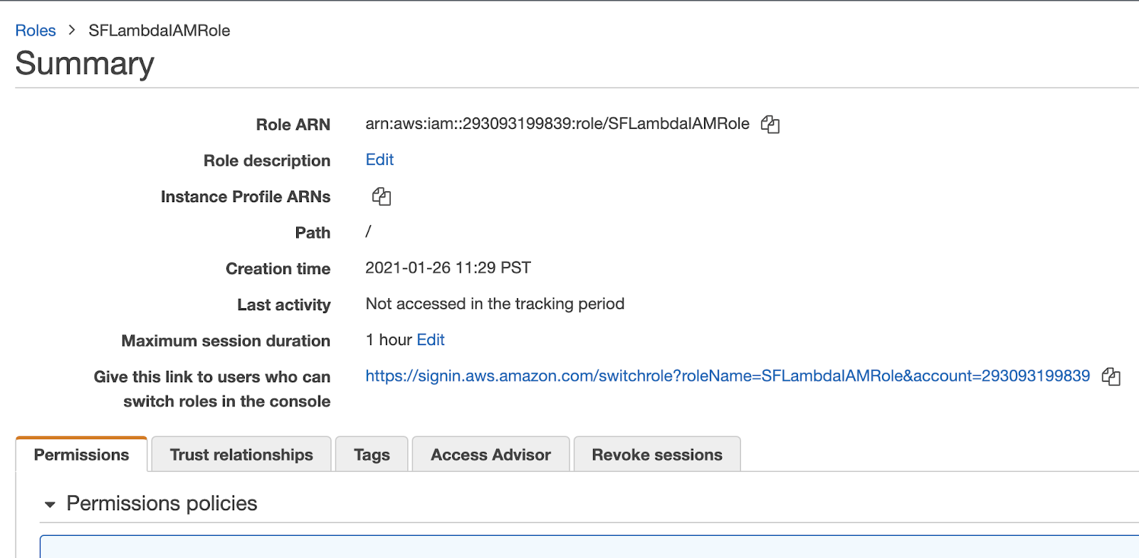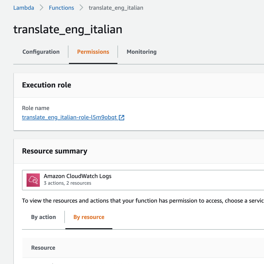 From the "Permissions" tab, select the displayed execution role. This will open a new IAM tab.