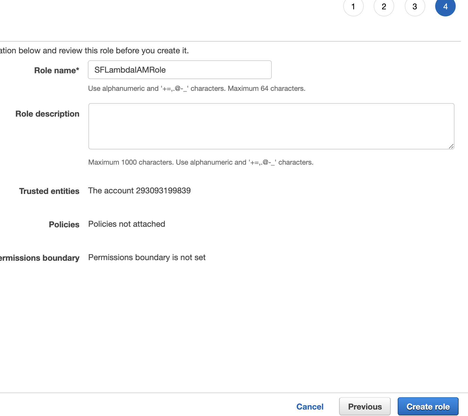 Once you're on the "Review" view, enter a role name. We used the name "SFLambdaIAMRole." Make a note of this name in your template as "New IAM Role Name." Then, click "create role."