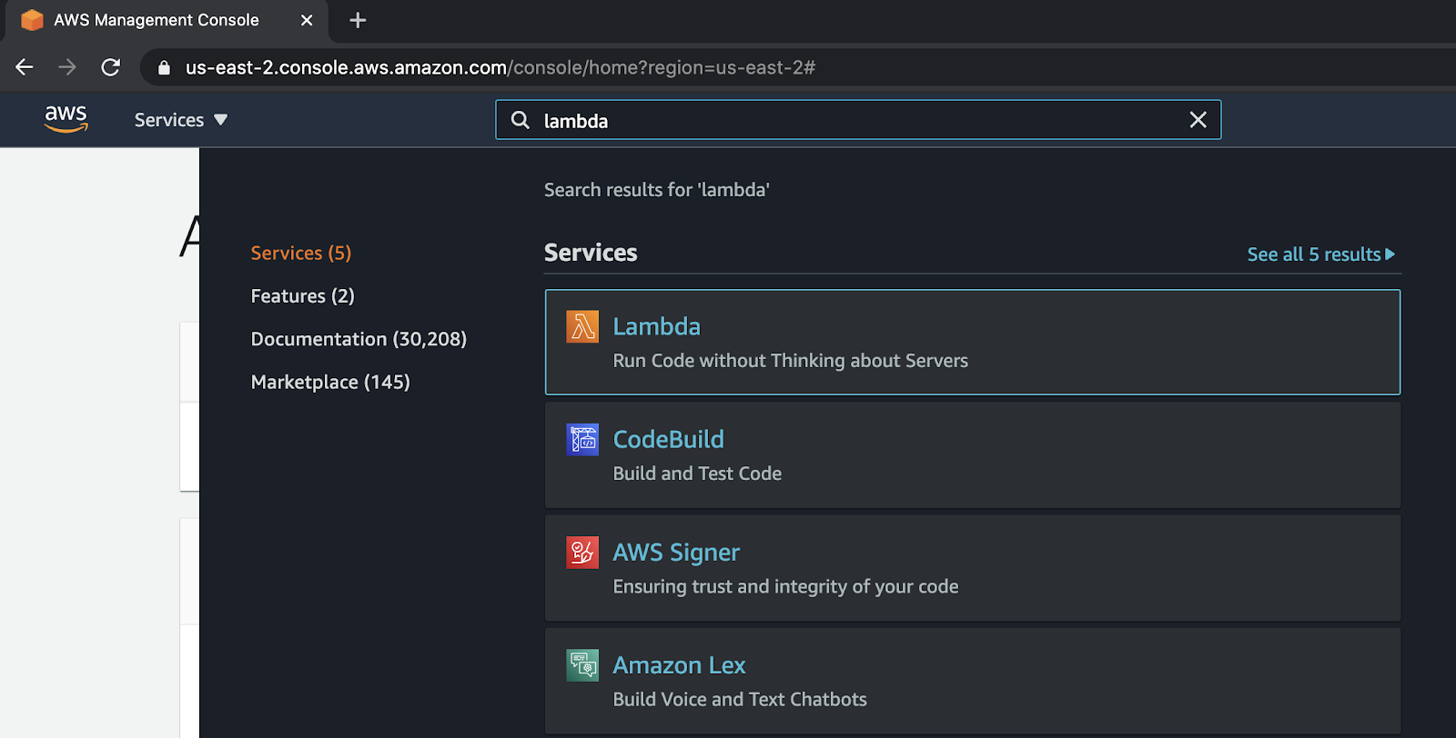 Once you have that written down, you need to create an AWS Lambda. To begin, go to the AWS main console, then search and select Lambda.