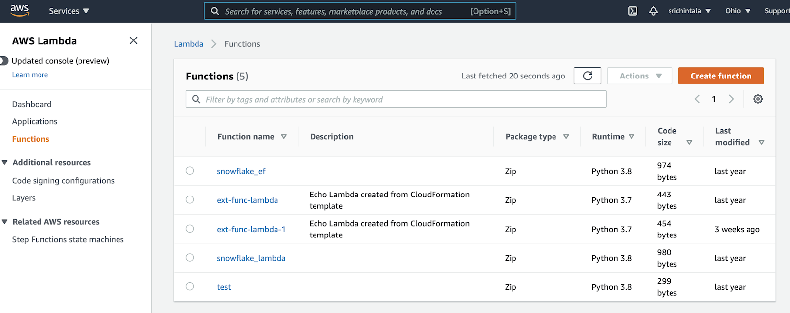 Now that you're on the AWS Lambda Function page click the "Create Function" button on the top right corner.
