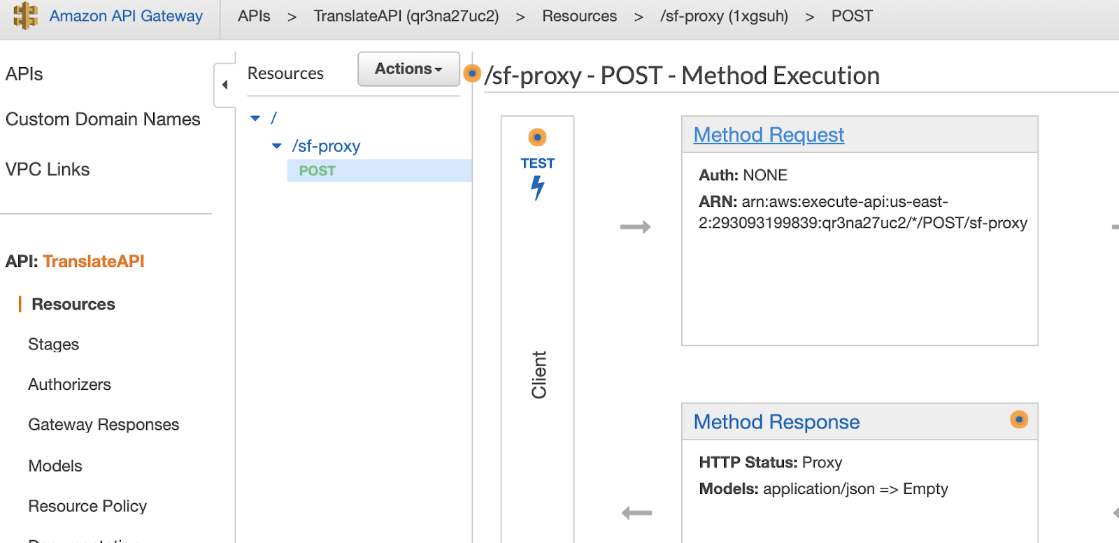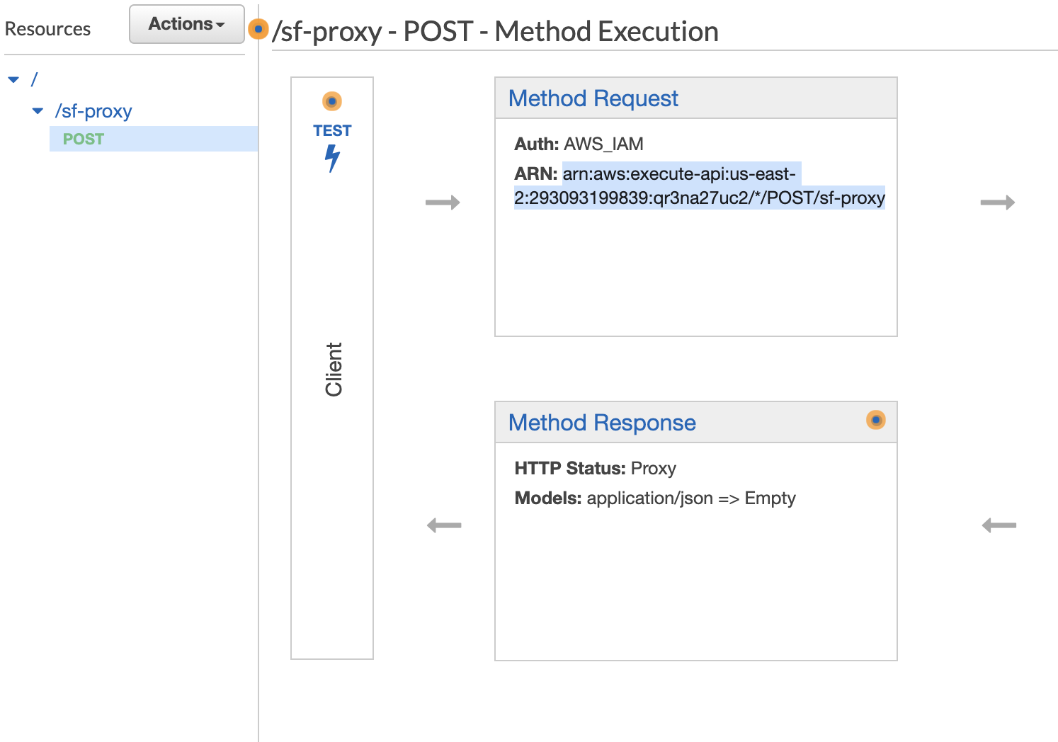 Then, click on "Method execution." Find the ARN under "Method Request." Record it as the "Method Request ARN" in the template.