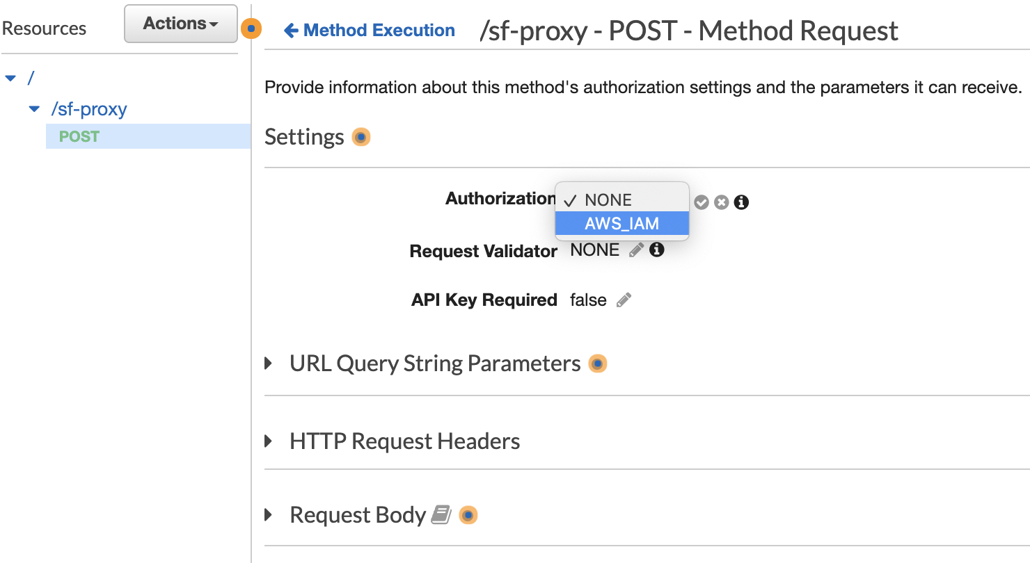 Inside the Method Request, click on the pencil symbol next to "Authorization" and choose "AWS_IAM." Click the checkmark just to the right to save.