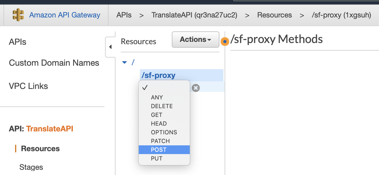 You will now be on a page that says "/Methods" at the top. From the "Actions" drop-down, select "Create Resource."