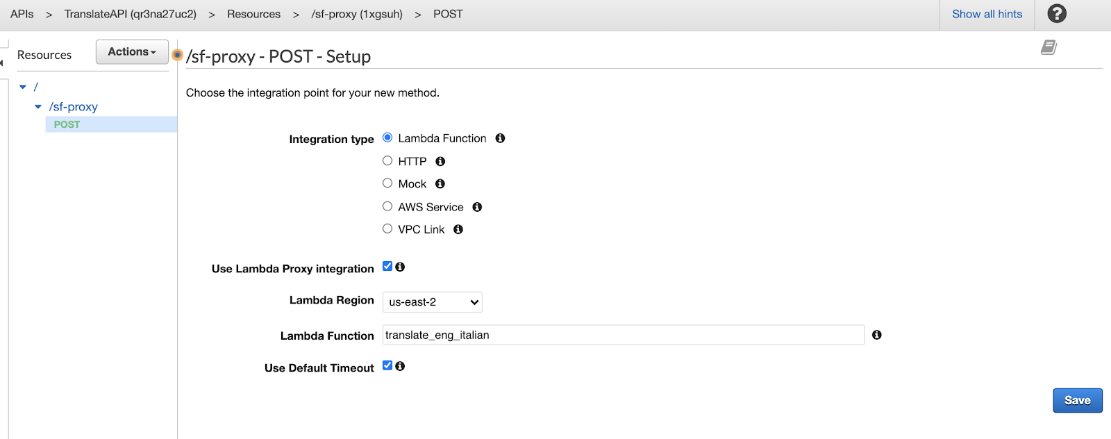 - Click the checkbox "Use Lambda Proxy Integration."