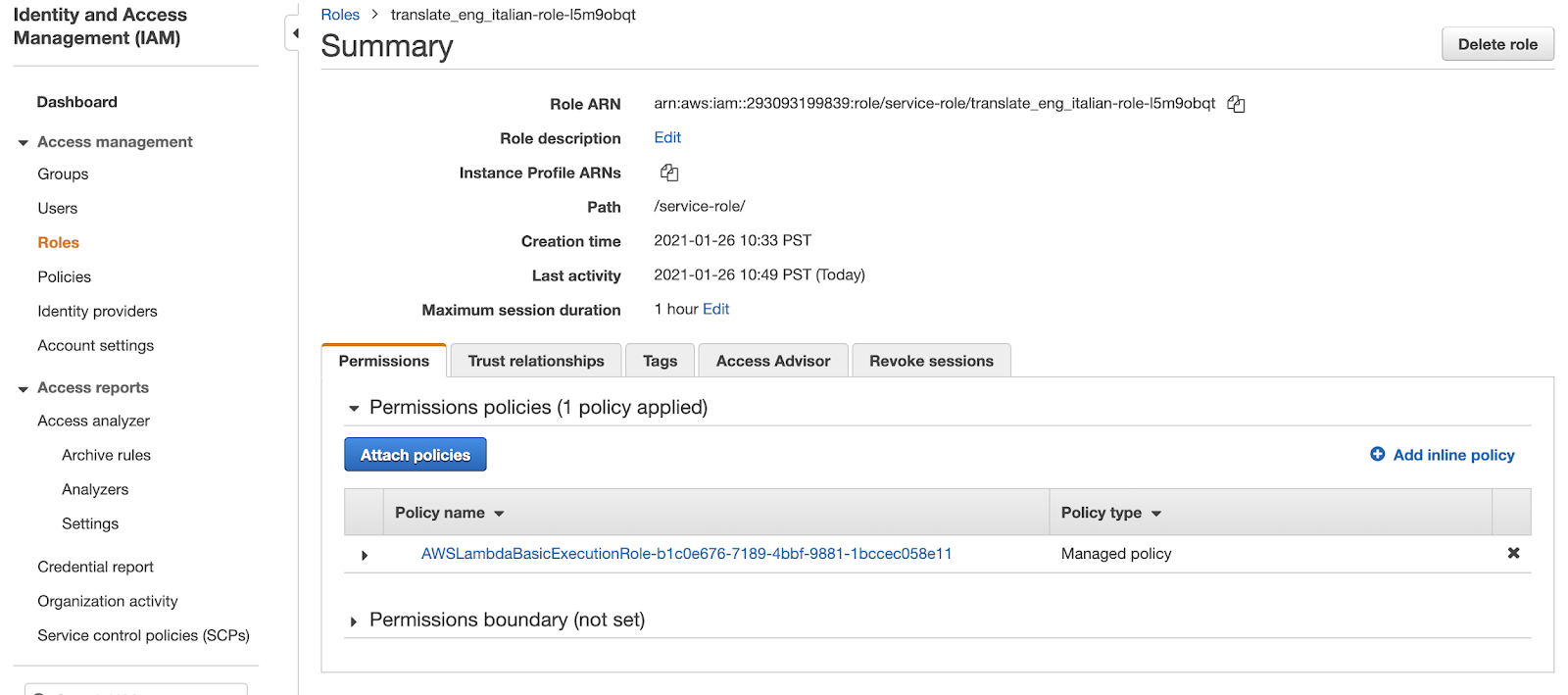 The next step is to attach the required policies that will allow your Lambda Functions to call Amazon Translate.
