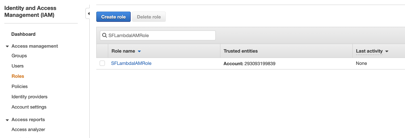 Select "Roles" and search for the New IAM Role Name that you created and recorded earlier. Select it.