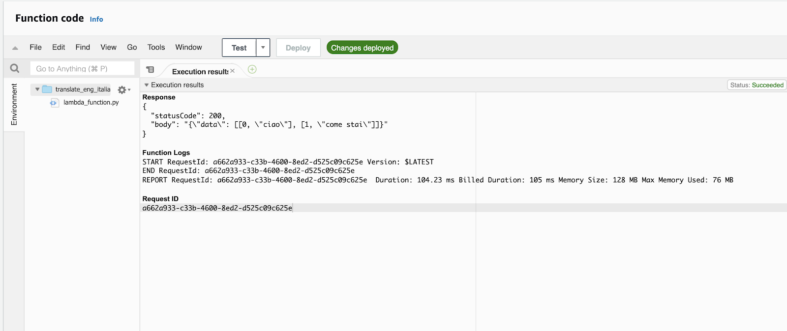 First, let's create a remote service implemented as a Python function executing in AWS Lambda. We'll be using a function written in Python that invokes the Amazon Translate API provided by Boto AWS SDK to return the Italian translation for a given input text string.
