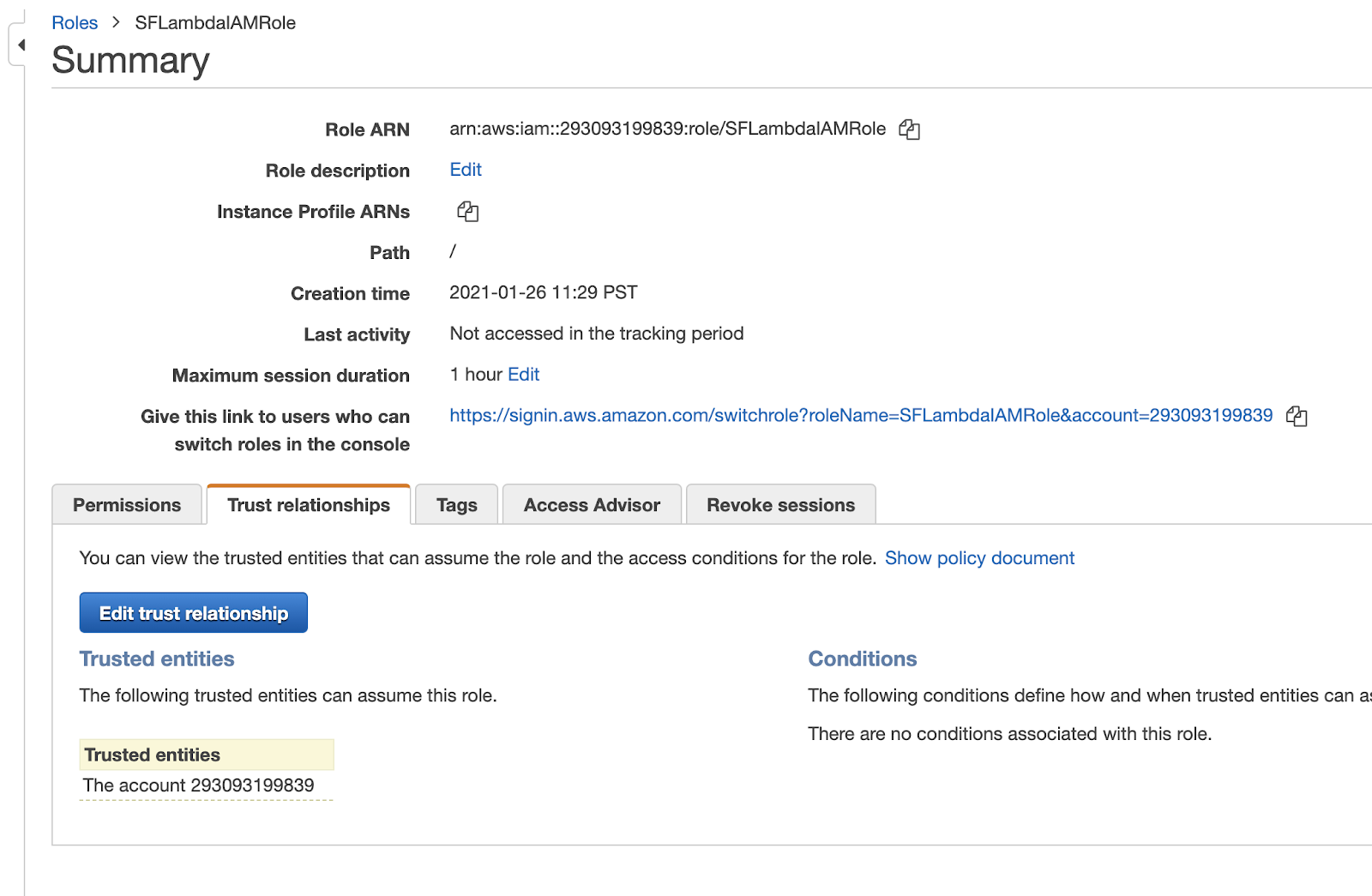 After you are done editing the "Policy Document" for the trust relationship, it should look similar to the following: