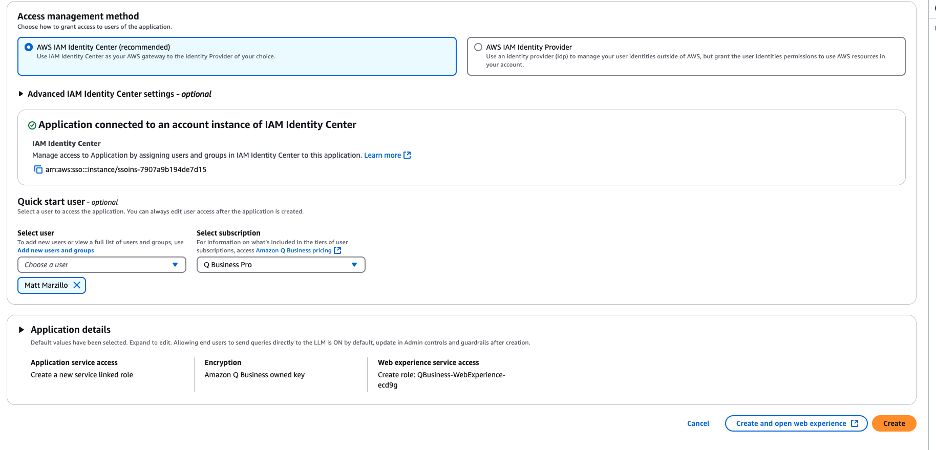 Head to you AWS console search "Amazon Q Business" then select the orange button "Create Application" then accept all of the default/recommended settings for creating your application, make sure that you have at least one user created for the app with a Q Business Pro subscription the select Create.