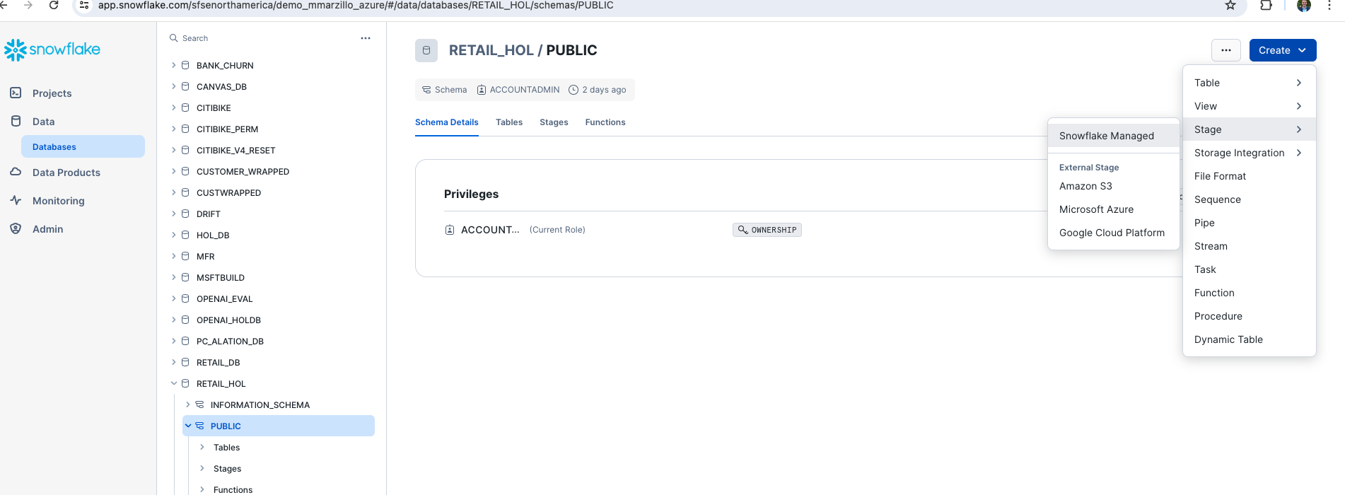 Let's create a stage in the RETAIL_HOL database that we just created and load images. Click on 'Databases' on the left panel and select the 'PUBLIC' schema then the blue 'CREATE' button on the top left and create a 'Snowflake Managed' stage.