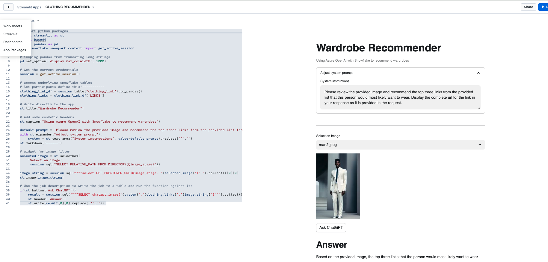 In this quickstart we will build a Streamlit application that leverages Snowpark External Access in Snowflake with Azure OpenAI that will generate a recommendation for clothing items given an image of a person.