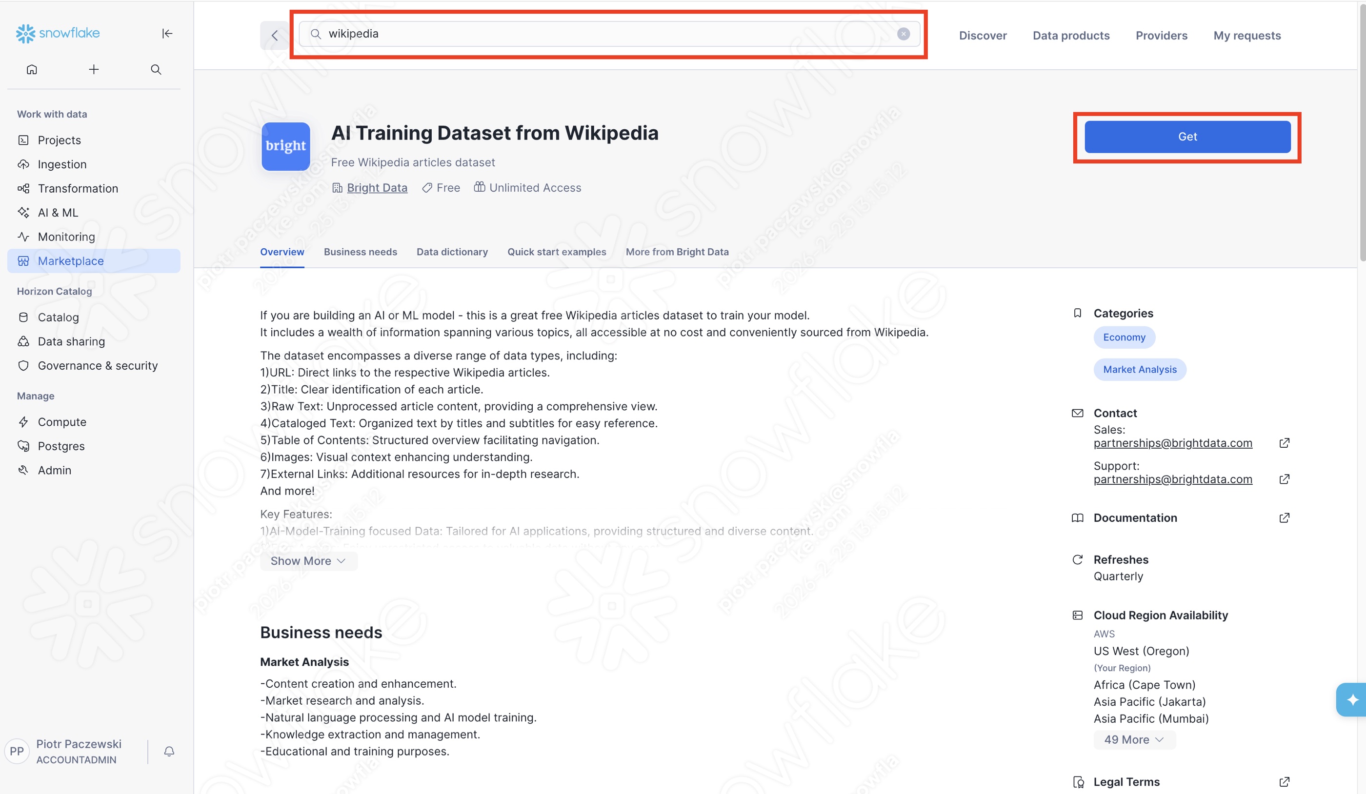 USE ROLE ACCOUNTADMIN; CALL SYSTEM$ACCEPT_LEGAL_TERMS('DATA_EXCHANGE_LISTING', 'GZT0Z4C8RF3FT'); CREATE DATABASE IF NOT EXISTS AI_TRAINING_DATASET_FROM_WIKIPEDIA FROM LISTING 'GZT0Z4C8RF3FT';