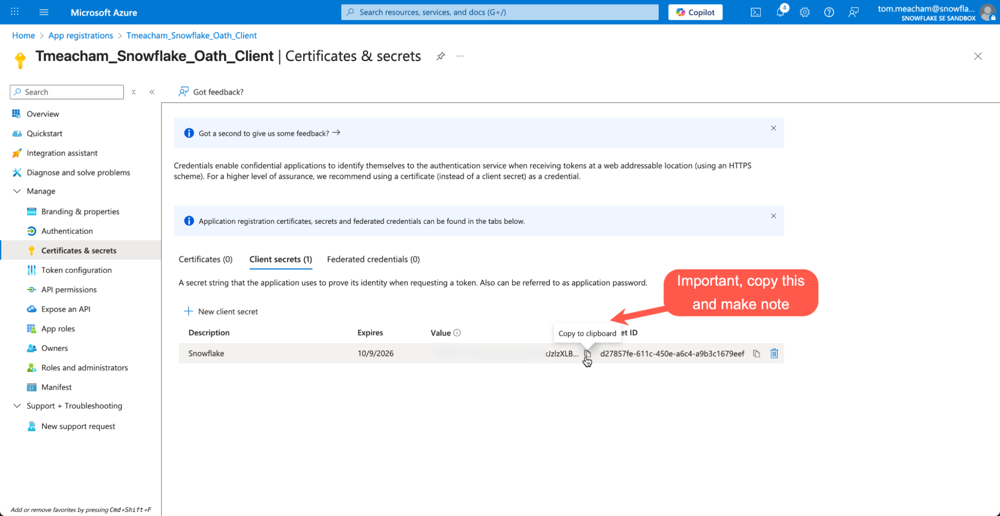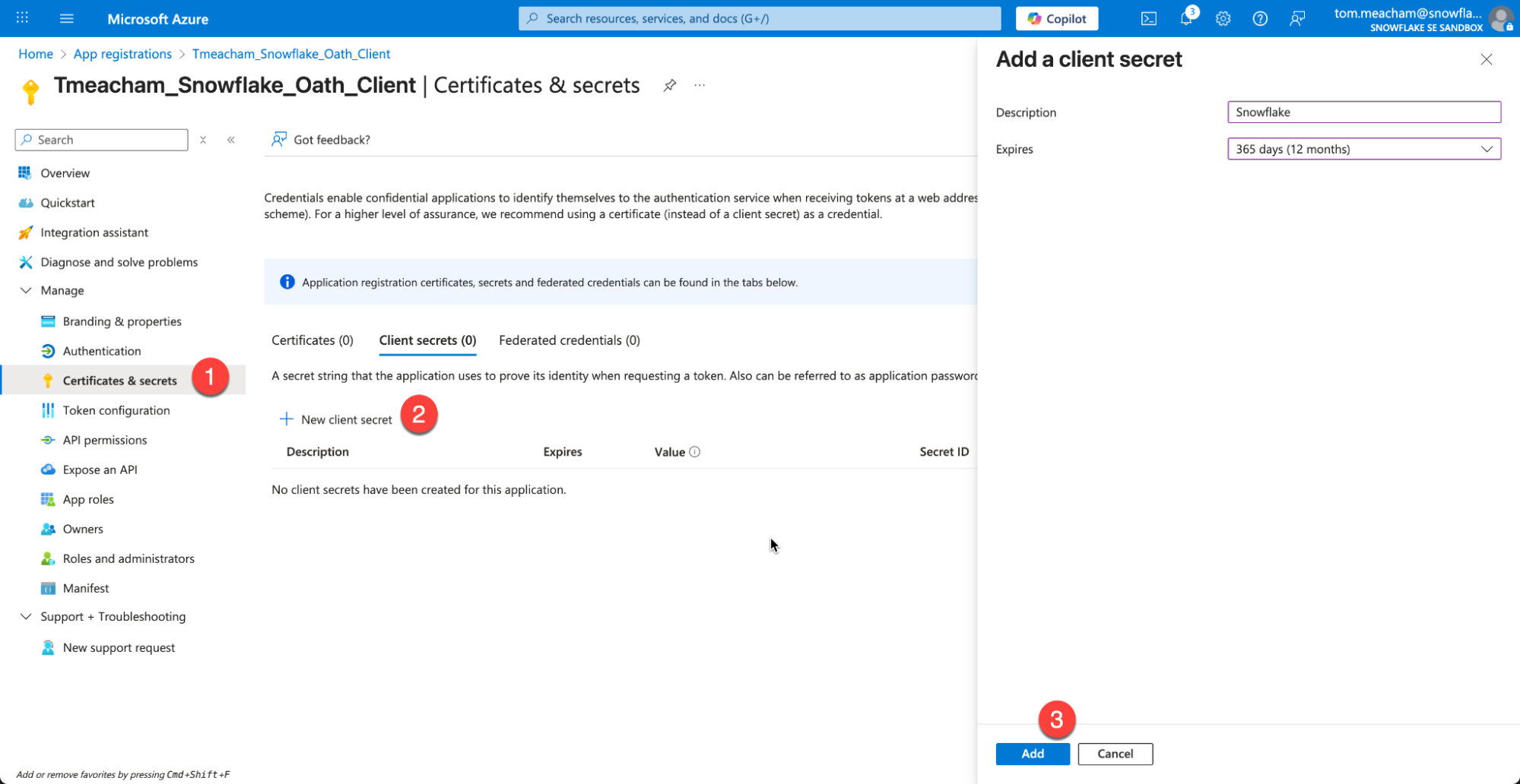 On the left hand menu, Click "Certificates & secrets" Click "New Client Secret" !!IMPORTANT!! Copy the Value, as it will not be available later. (Secret ID doesn't not matter)