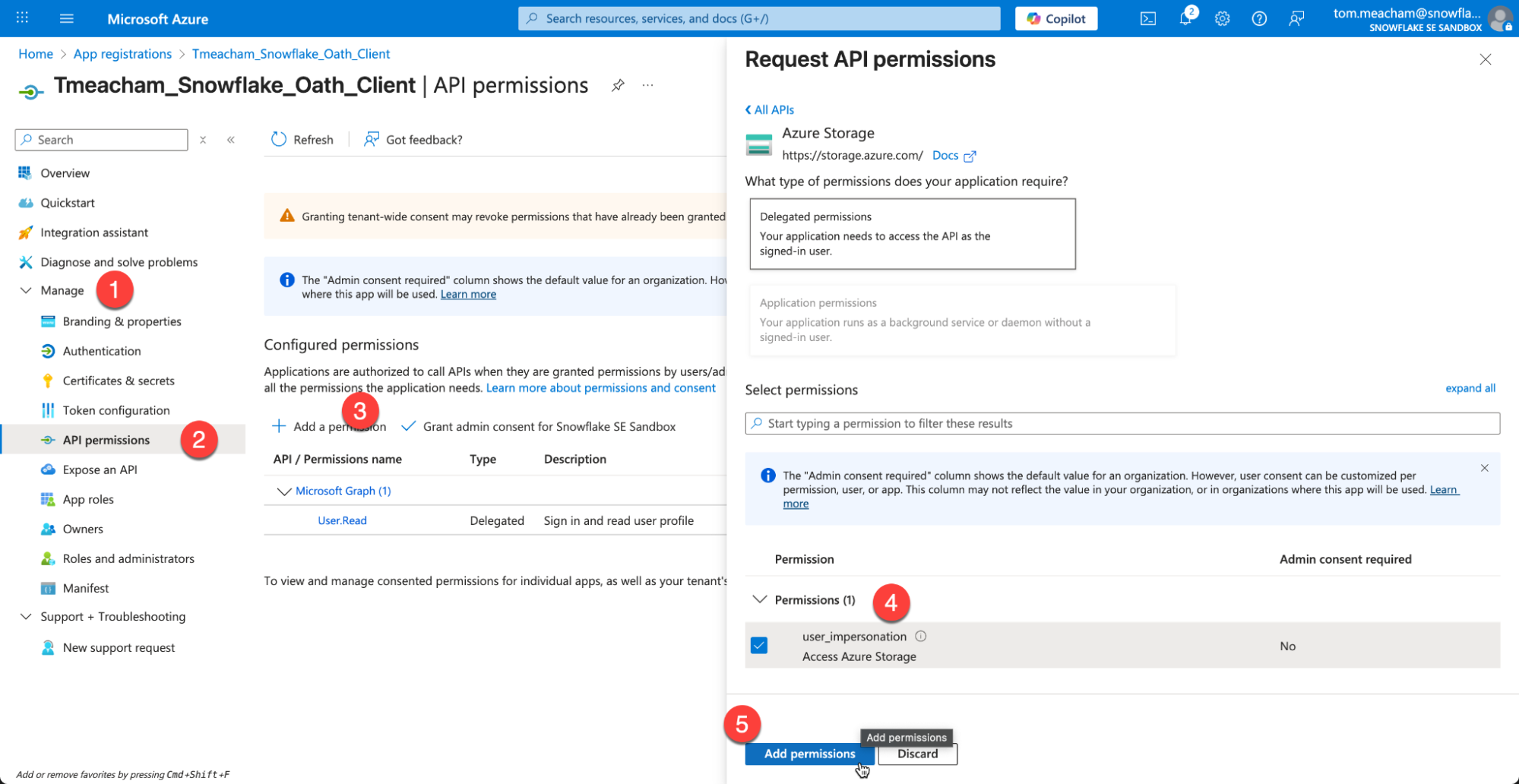Under Manage, choose API Permissions Under Configured permissions, click "Add a Permission" Select the Azure Storage tile. Check the box for user_impersonation Click Add Permission