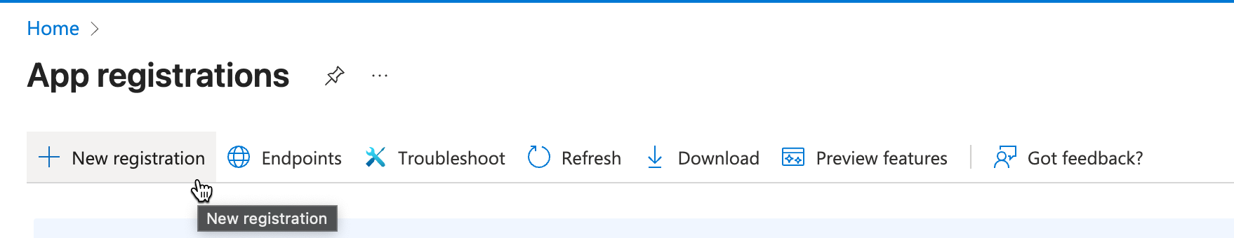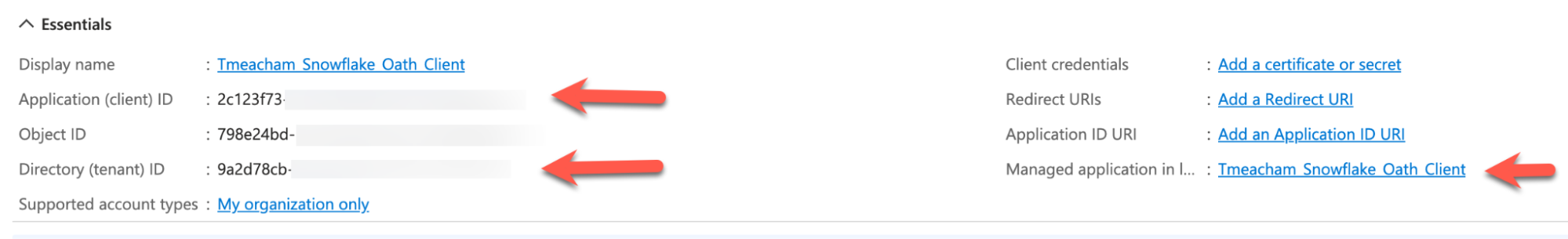 Give the app name (ex. _Snowflake_Oath_Client ) Create by clicking "Register" Copy and make note of the "Directory (tenant) ID" Copy and make note of the "Application (client) ID" Copy and make note of the "Managed application in local directory" Name -- used for "Managed Access" step
