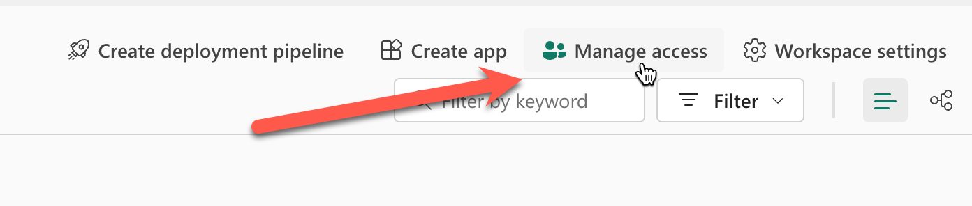 - Return to your Fabric Workspace and Click Manage Access in the top right of the interface. Make sure you are in your Fabric Work Space, and NOT your Lakehouse interface.