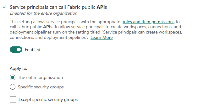 In the Fabric Admin Portal, in Tenant Settings under the Developer Settings category, "Service Principals can call Fabric public APIs" is ENABLED.