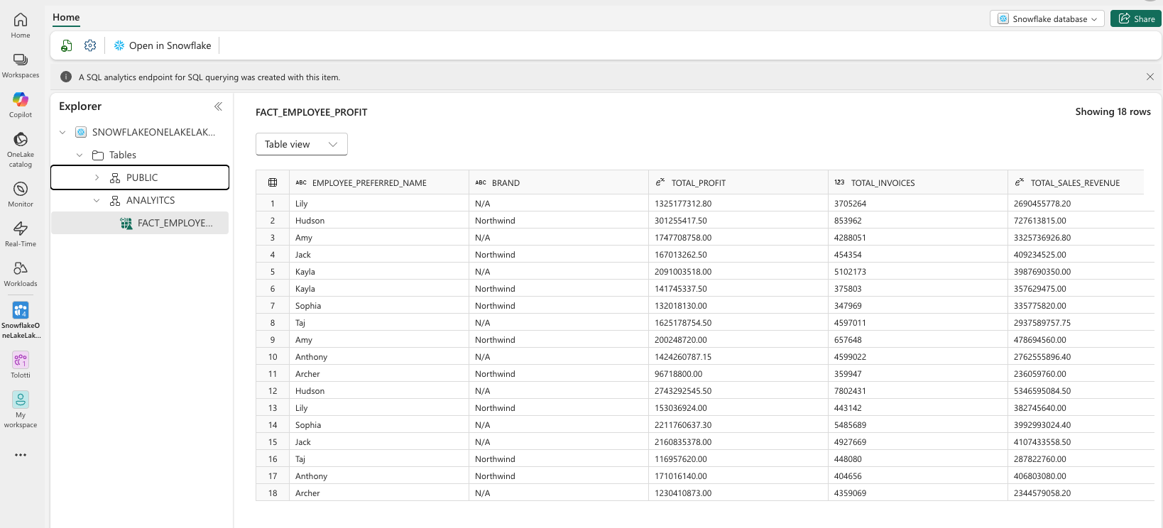 For Snowflake database, select SNOWFLAKEONELAKELAKEHOUSE_ANALYTICS and continue.