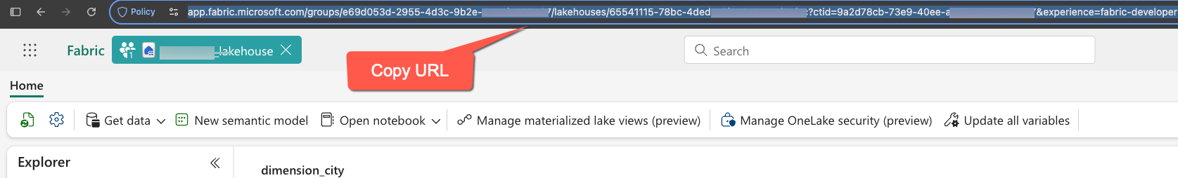 - Click on your Lakehouse to fetch the following values from the url in the browser (just copy url)