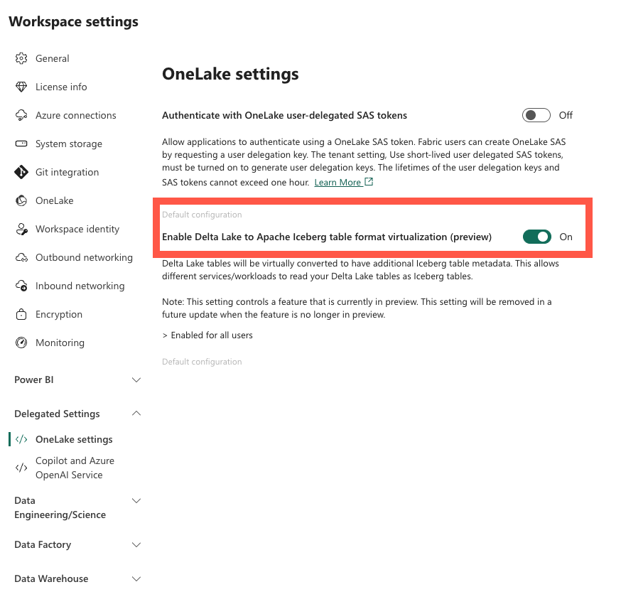 - For Fabric workspace name, enter the name of the workspace in Fabric where you want to view your Iceberg tables.
