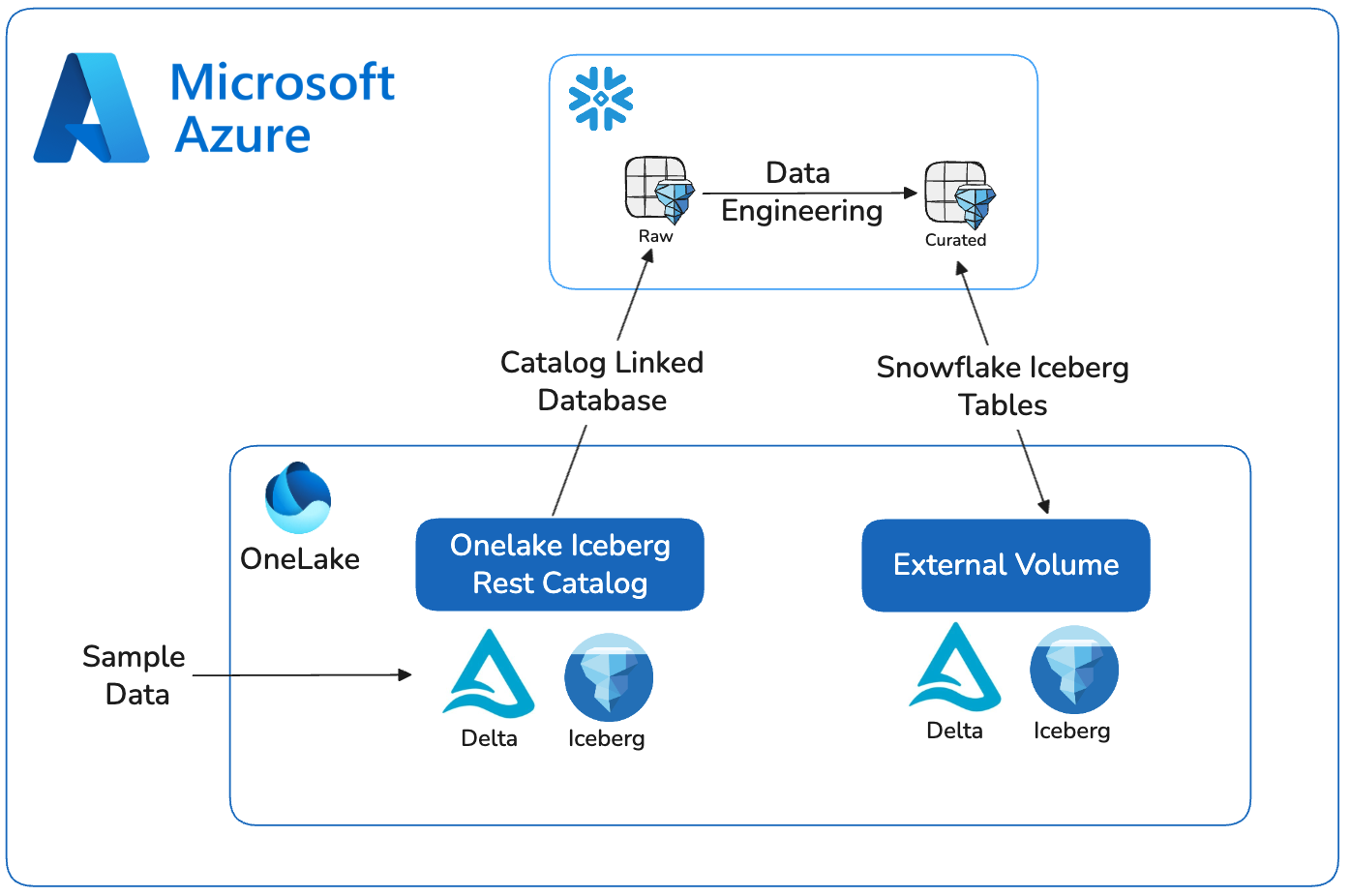 - You will build a fully interoperable, open lakehouse by integrating Snowflake with Microsoft OneLake. You will get sample data in Fabric, create an external volume, set up OneLake as an Catalog Linked Database in Snowflake, and create Iceberg tables in OneLake. The end result is a seamless data architecture where Snowflake can manage and query data stored in the open formats of OneLake.