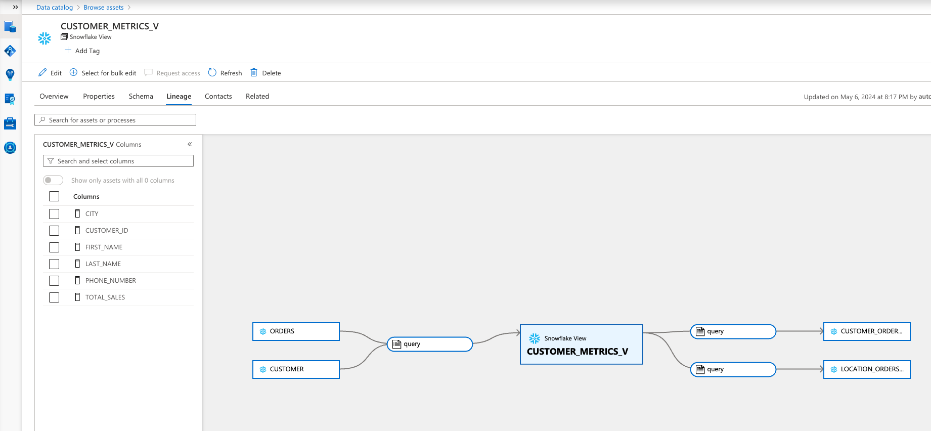 From the Data Catalog Home page, search for "CUSTOMER_METRICS_V"