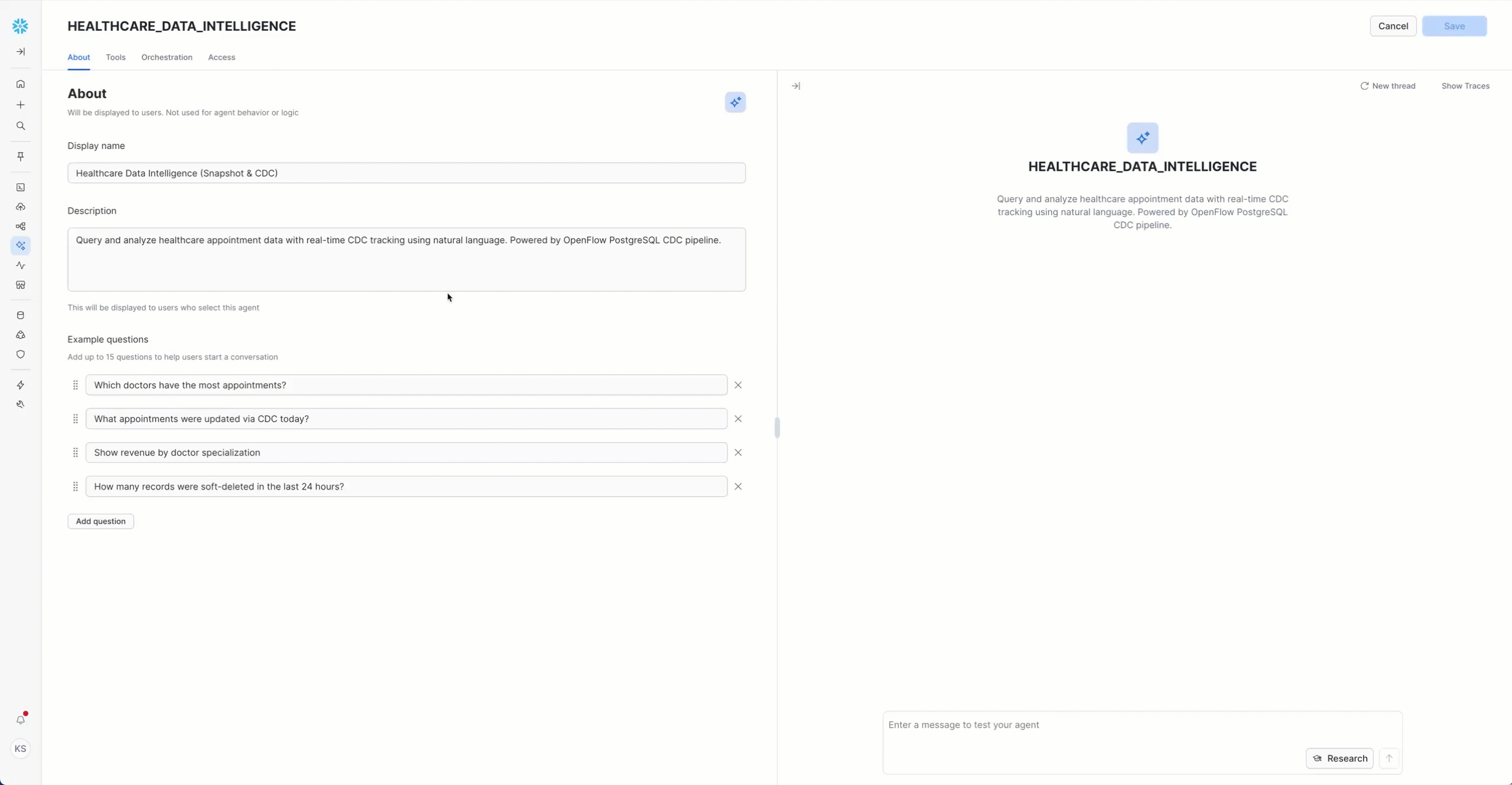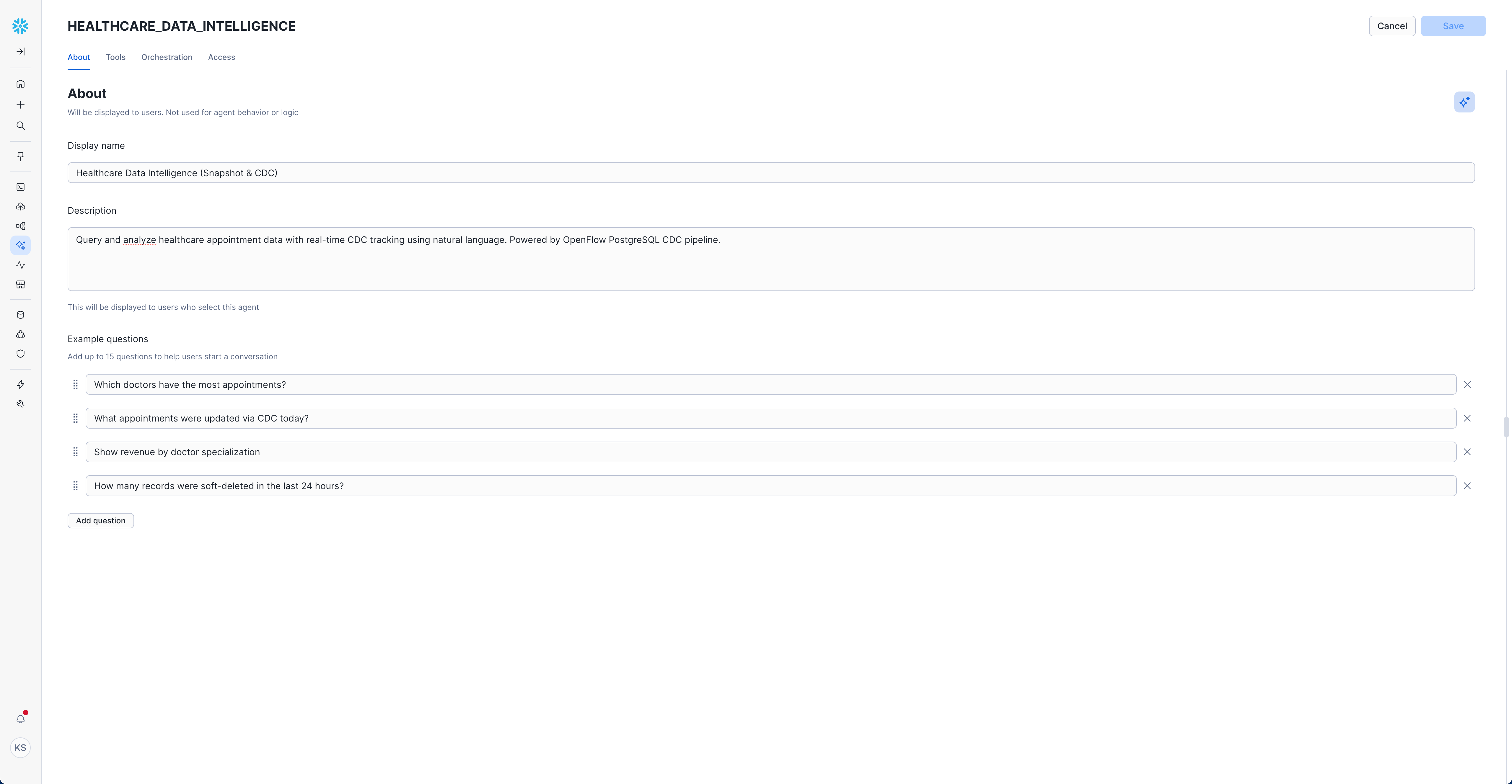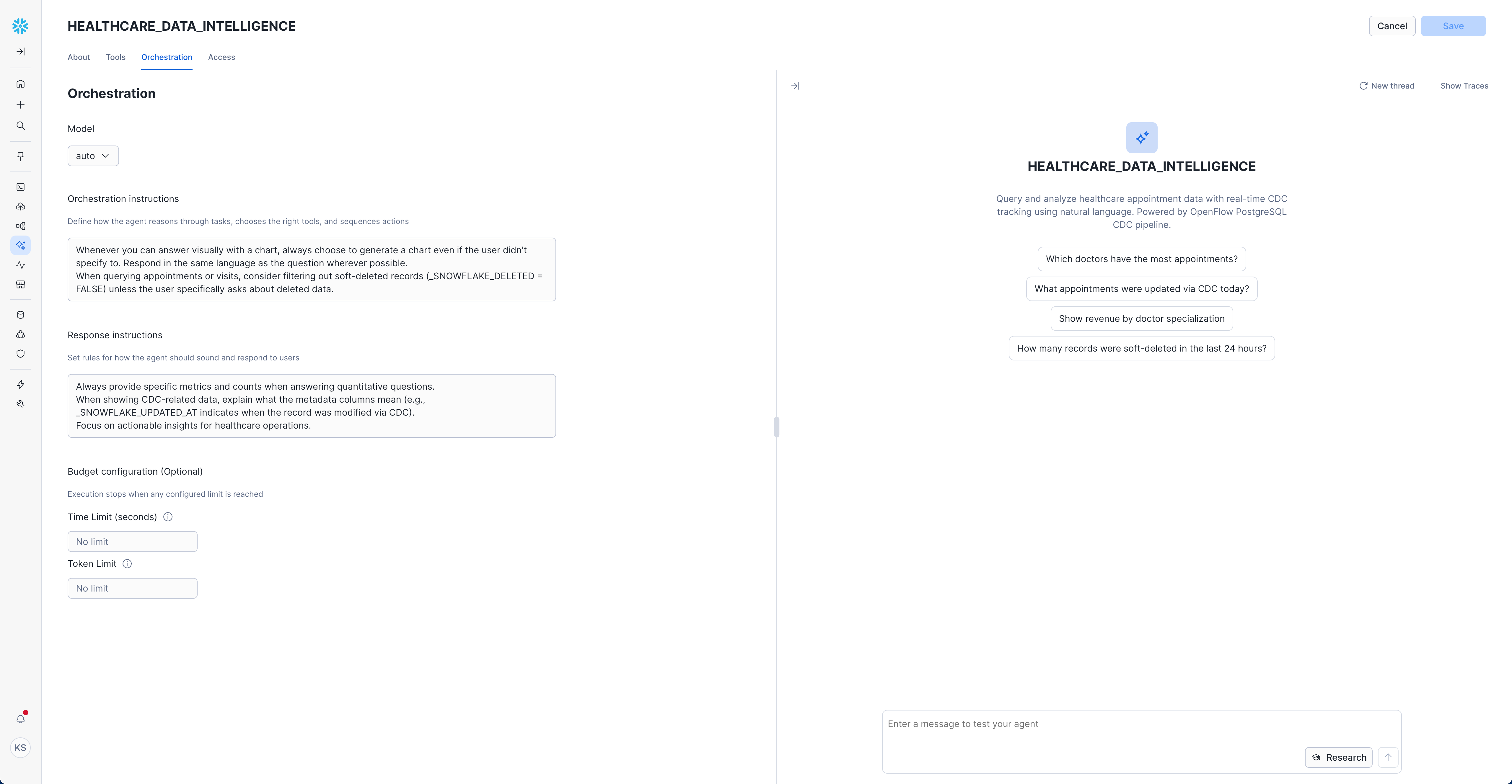 Pro Tip: Snowflake Intelligence understands the CDC metadata columns and can differentiate between snapshot data and real-time changes. Try asking comparative questions like "Show me only the appointments that changed today" to see CDC-specific insights!