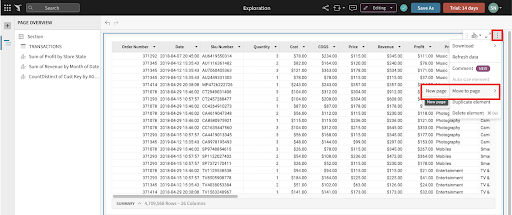 - To start, let's move our base data table to another page. This is done by selecting the options button (the three-dots icon) in the top right of the table and clicking on “Move to page” -> “New page”.