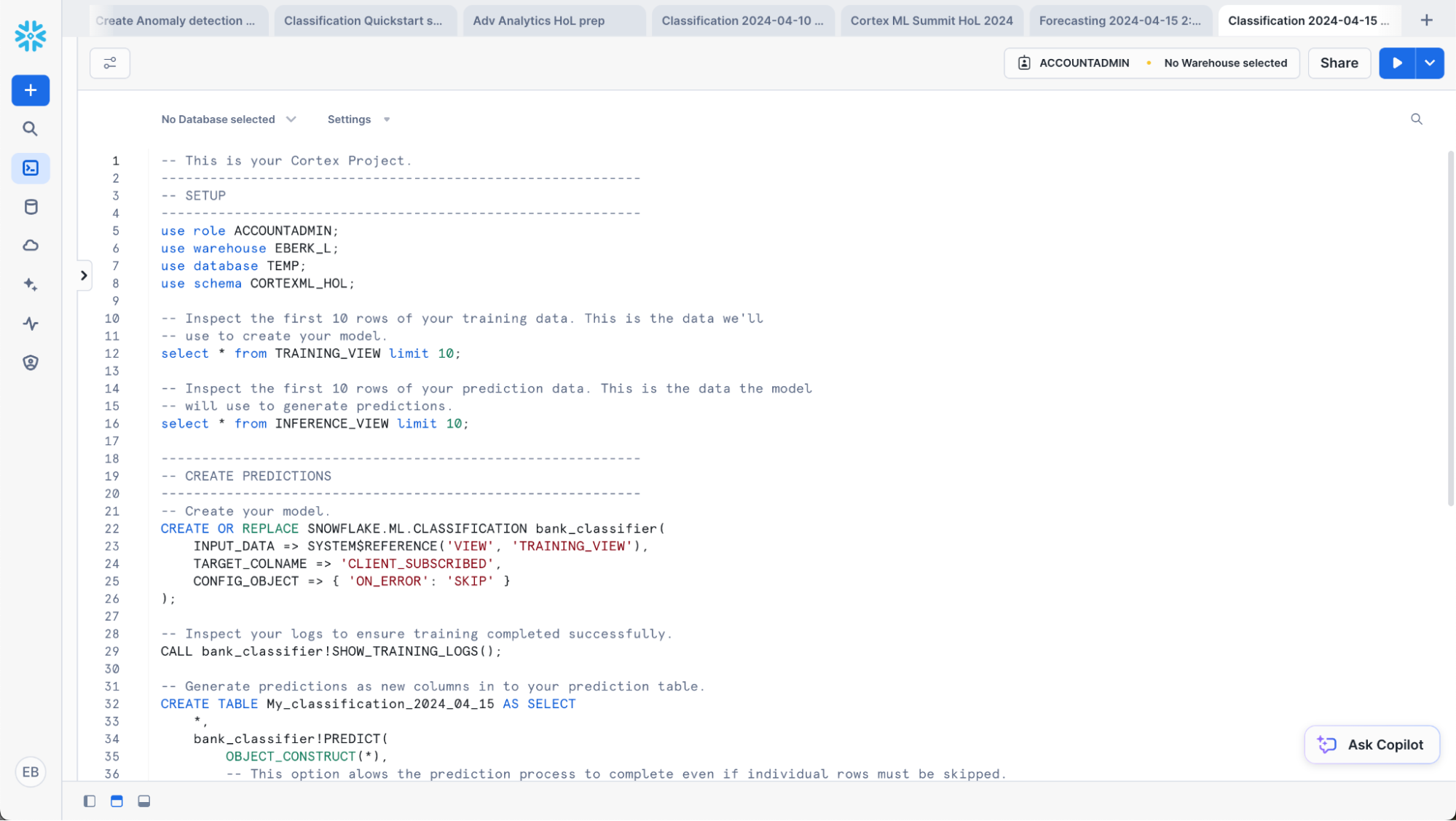 The results? A worksheet with all of the SQL you need to train your model, generate predictions and evaluate your results.