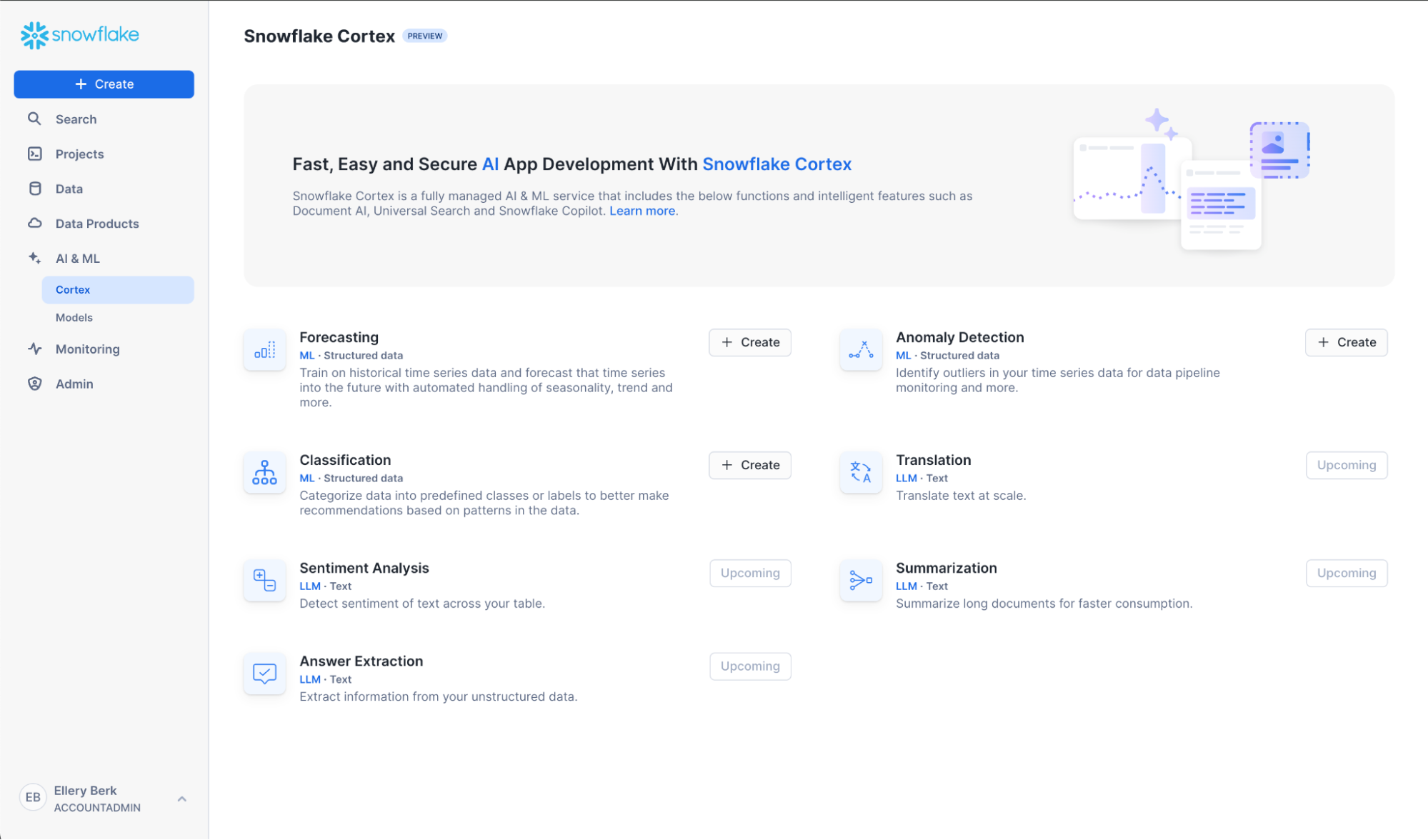 First, navigate to Snowsight. Click “Create” next to the Forecasting button below.