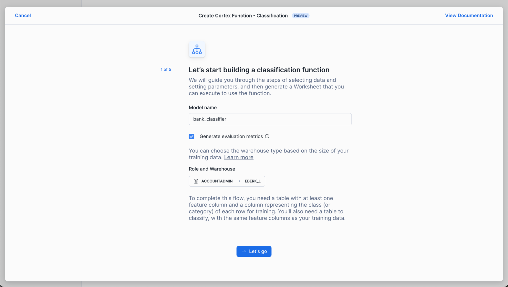 Name your model bank_classifier, or whatever suits you! Also, select a role and warehouse. See the in-context warehouse suggestions for help on warehouse selection. Note that we’re leaving “Generate evaluation metrics” checked, since we want to evaluate our model after we’ve trained it.