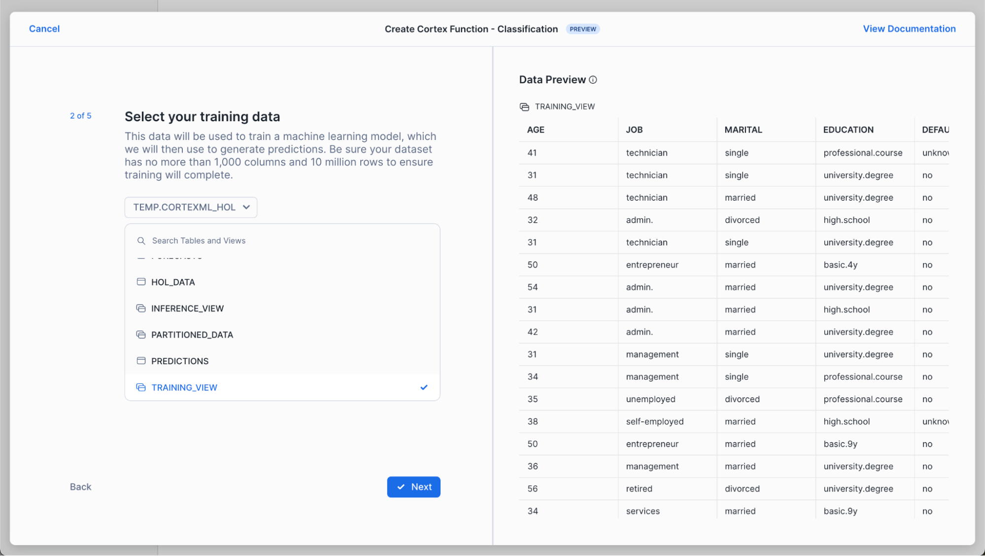 Next, choose training_view from the database and schema you’ve been working in. A data preview should automatically appear – to help us sanity check that the data are as expected.