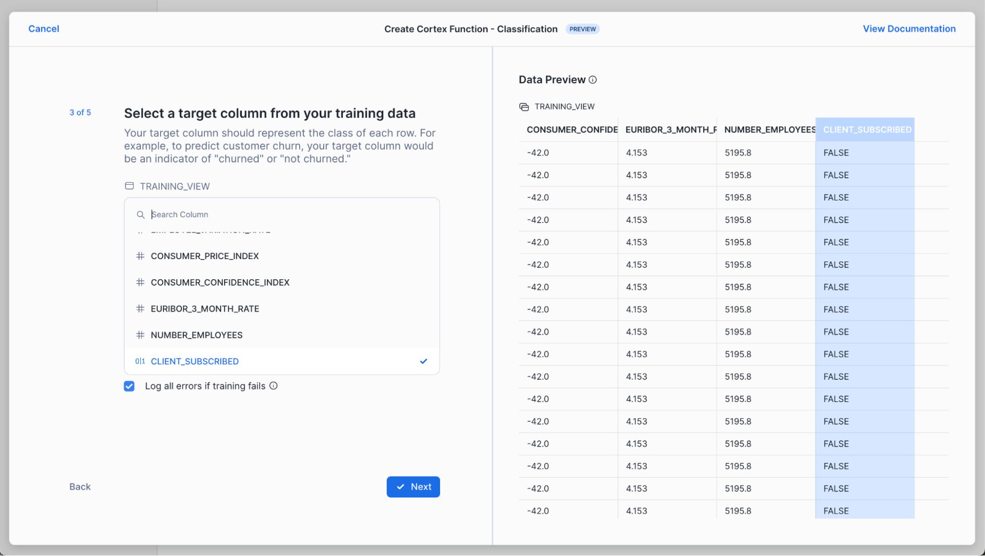 Choose client_subscribed as your target column. This is the column you want to predict for new customers (i.e., whether new customers will subscribe or not to your product). We leave “Log all errors if training fails” checked to allow the training process to complete and log all relevant errors instead of stopping at the first error encountered. This is helpful for debugging.
