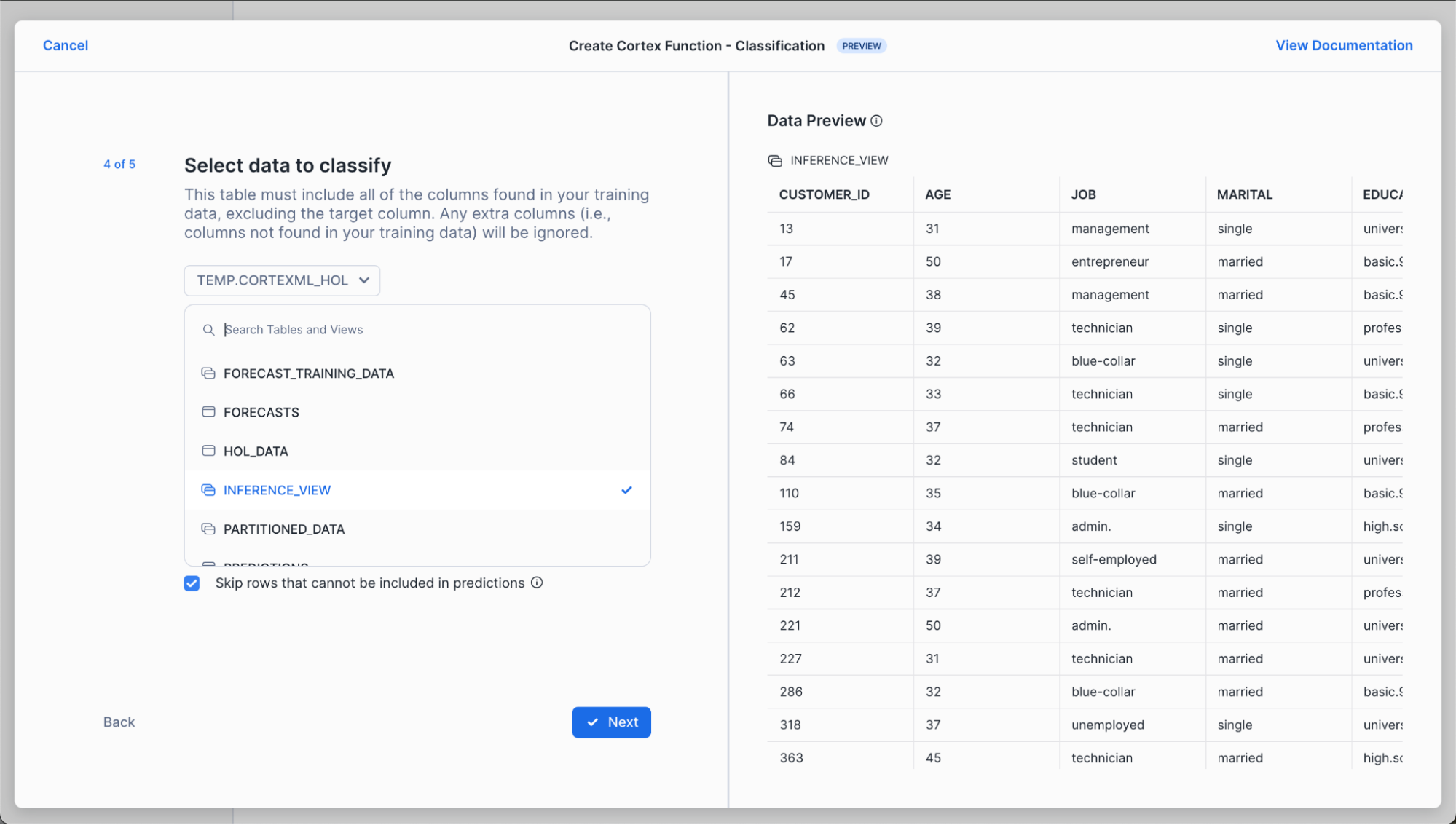 Now, select the data you’d like to classify. In this scenario, we’re selecting a new set of customers to predict whether they’re likely to subscribe to our product or not. Note that we keep “Skip rows that cannot be included in predictions” so that we can get predictions for as many rows as possible without failing the whole process when a row without sufficient informationis encountered.