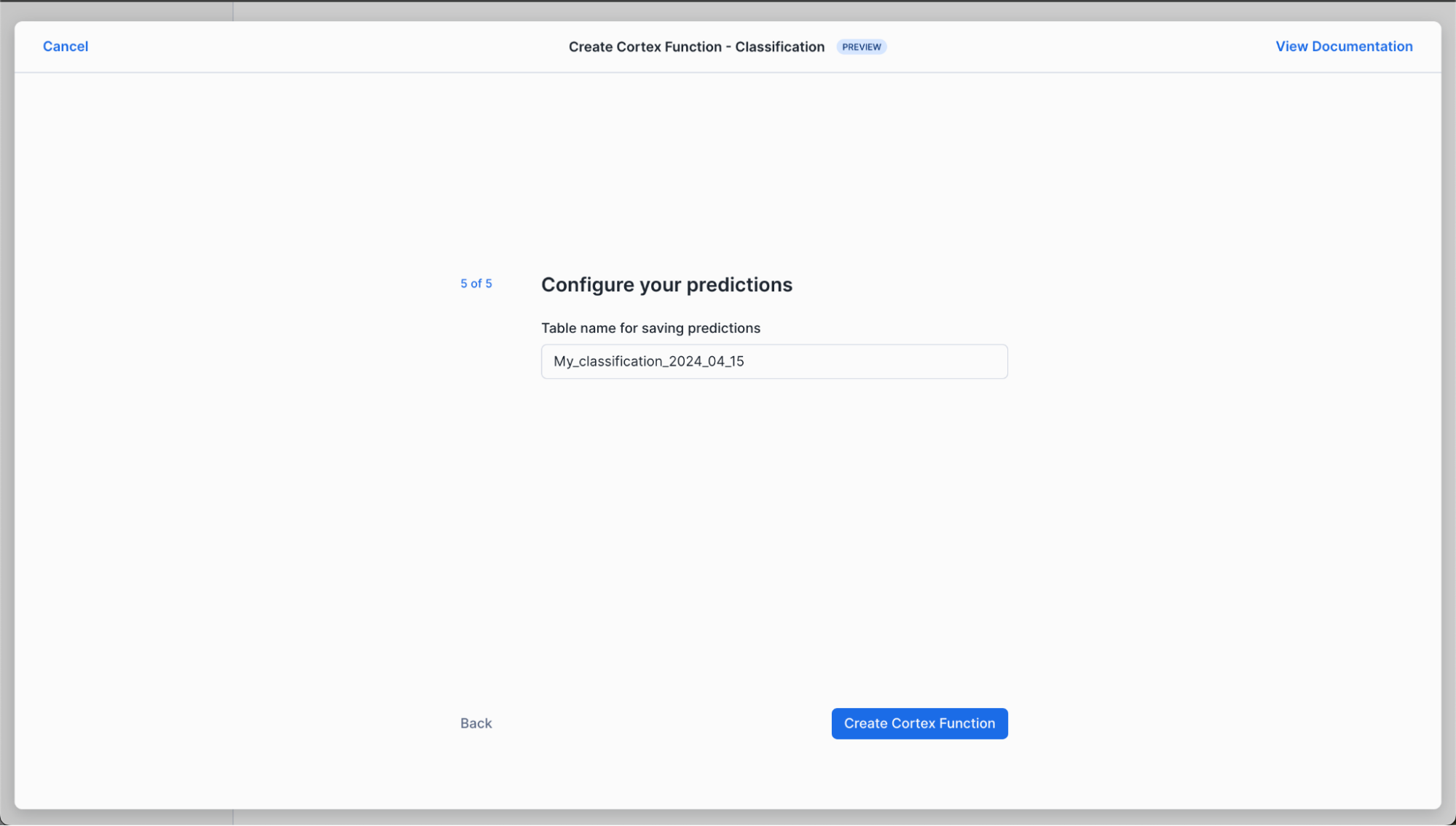 Finally, we select our prediction interval width and name the table we want to store our predictions into.