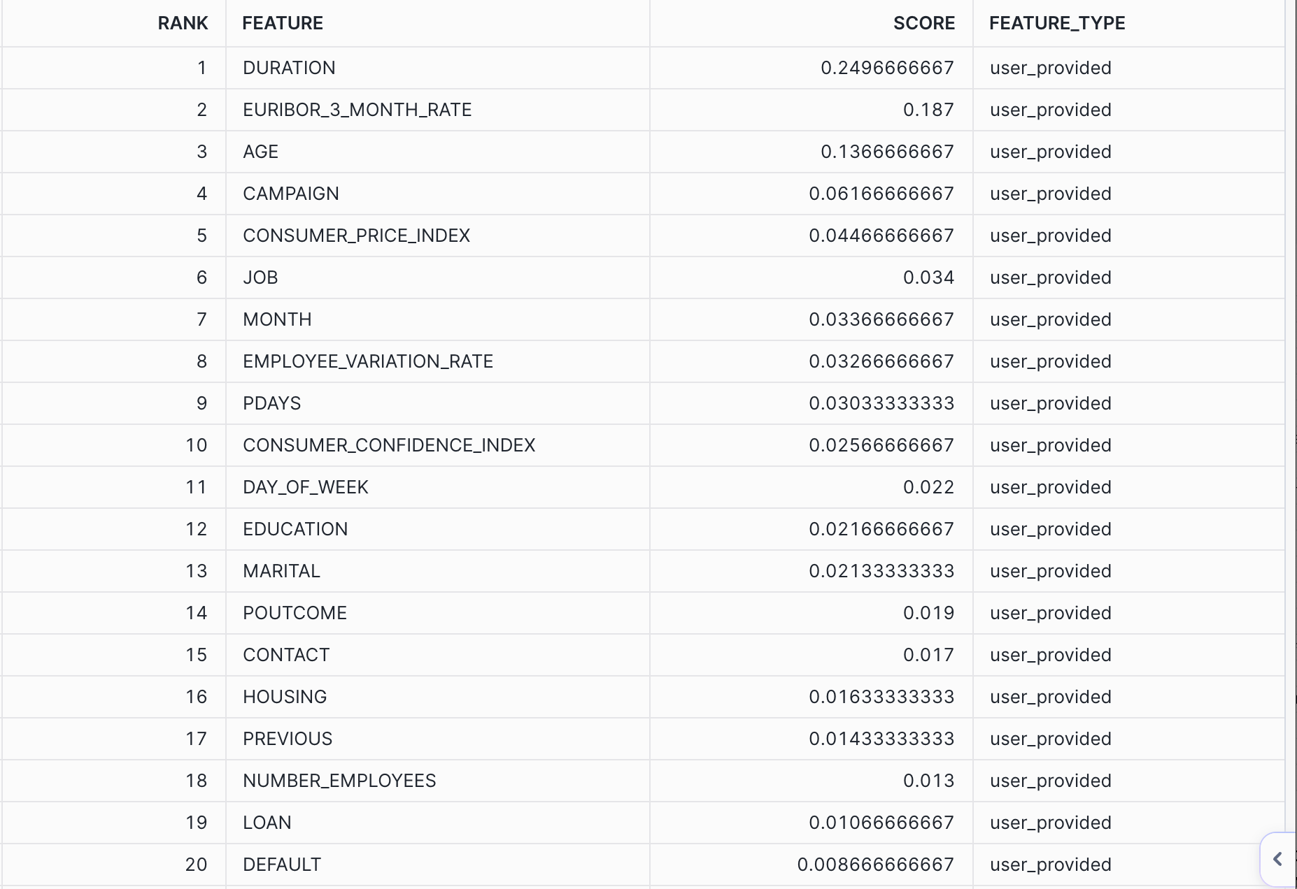 CALL bank_classifier!SHOW_FEATURE_IMPORTANCE();