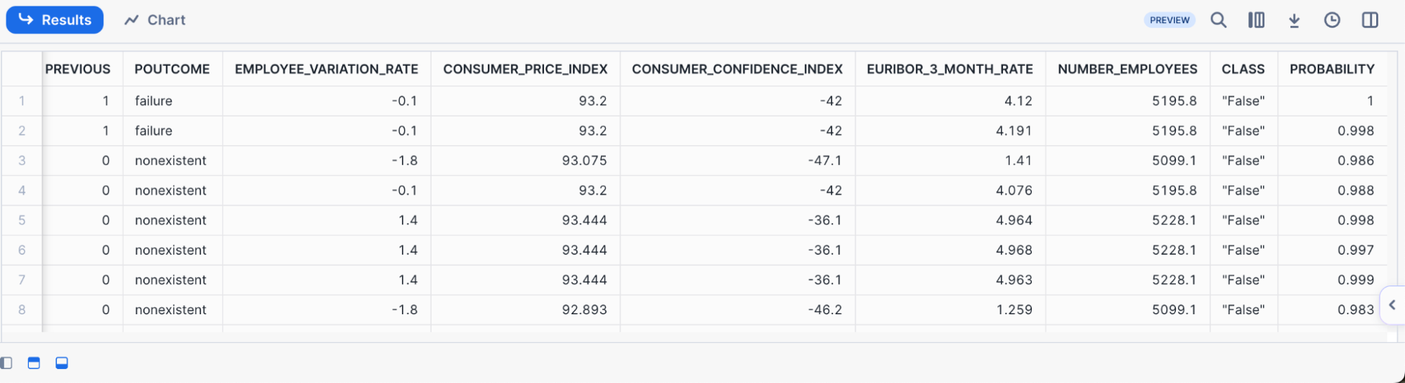 In the result set, we see that the model produces both a predicted class denoted by True or False as well giving us the probability of the respective class membership. Oftentimes, we may want to parse out the probabilities or the prediction directly, and have it in its own column.