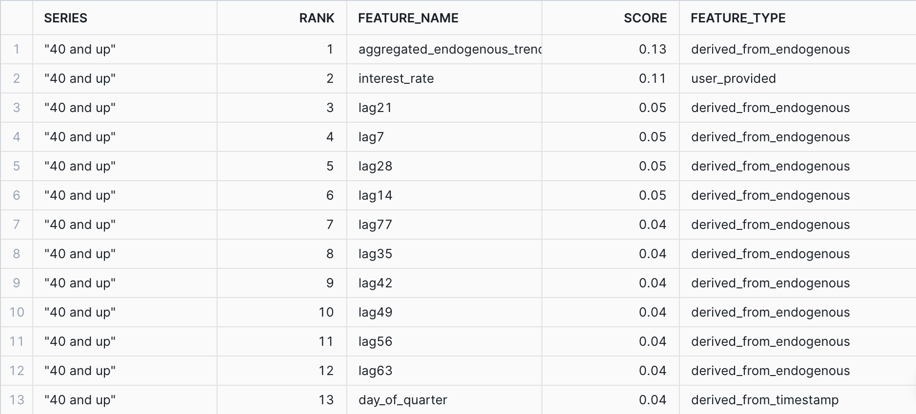 -- Inspect the relative importance of your features, including auto-generated features. CALL forecast_subscriptions_model!EXPLAIN_FEATURE_IMPORTANCE();