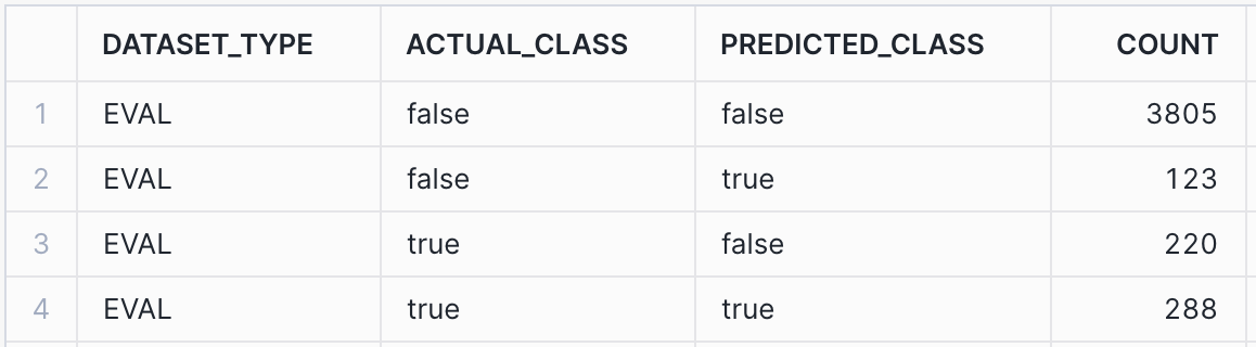 -- Calculate the evaluation metrics CALL bank_classifier!SHOW_EVALUATION_METRICS(); CALL bank_classifier!SHOW_GLOBAL_EVALUATION_METRICS();